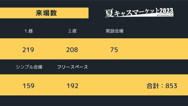 219 208 75 合計:853 来場数 1.昼 2.夜 常設会場 159 192