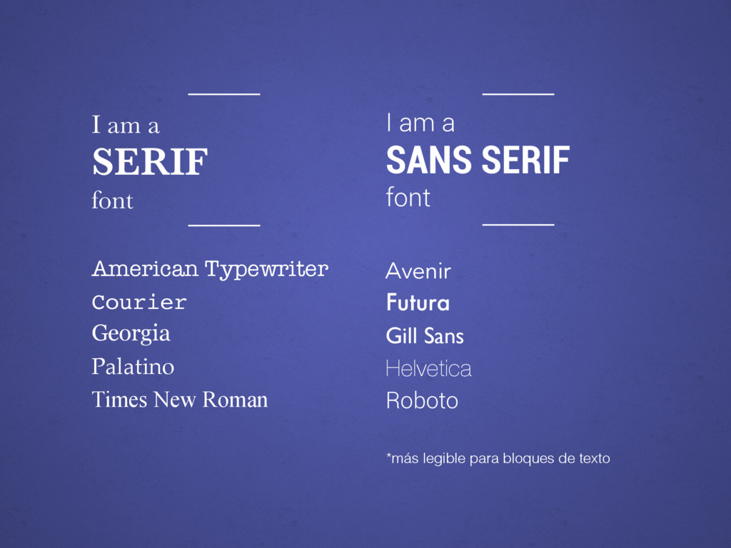 y poder expresar ideas con ellas. Existen más de 25,000 familias o tipos de tipografías. Todas estas tipografías se dividen en: Serif y Sans- Serif fonts, entre otras.