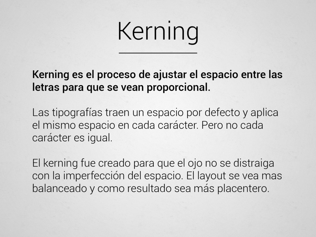 las letras para que se vean proporcional. Las tipografías traen un espacio por defecto y aplica el mismo espacio en cada carácter. Pero no cada carácter es igual. El kerning fue creado para que el ojo no se distraiga con la imperfección del espacio. El layout se vea mas balanceado y como resultado sea más placentero.