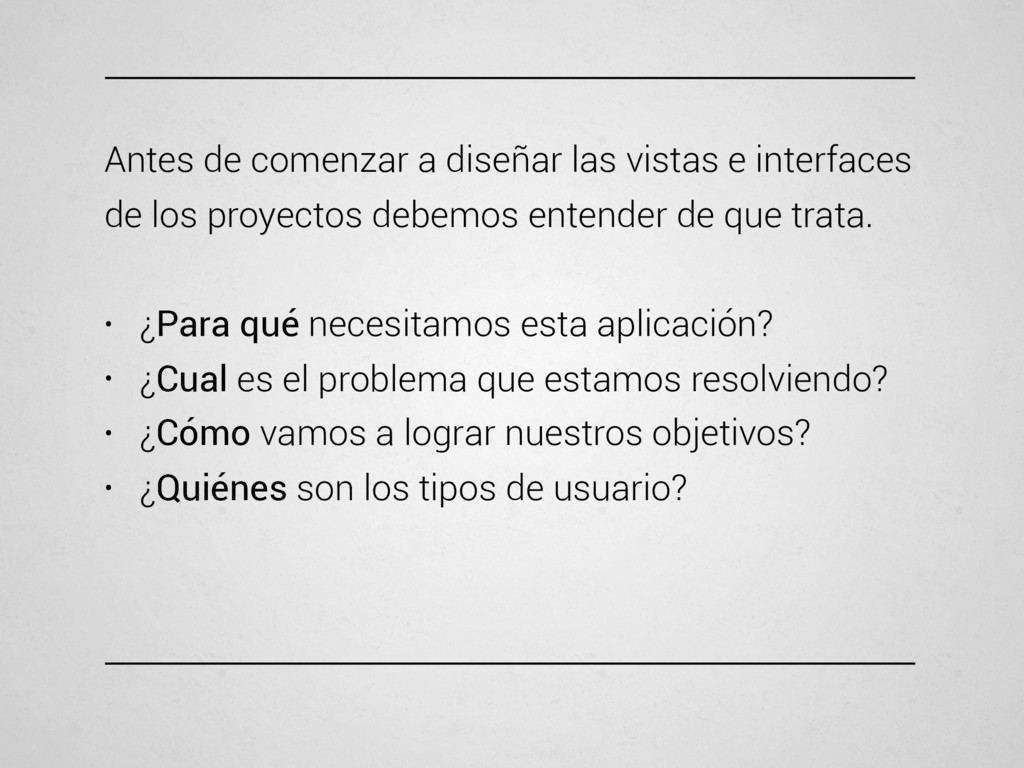 los proyectos debemos entender de que trata. • ¿Para qué necesitamos esta aplicación? • ¿Cual es el problema que estamos resolviendo? • ¿Cómo vamos a lograr nuestros objetivos? • ¿Quiénes son los tipos de usuario?