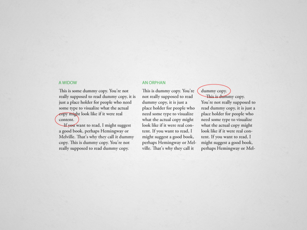 palabra o corta linea al final de un párrafo. Es considerado mala tipografía porque deja mucho espacio en blanco al ojo en el párrafo. Un orphan es lo mismo a un widow pero cuando queda una palabra o linea corta al principio de una pagina.