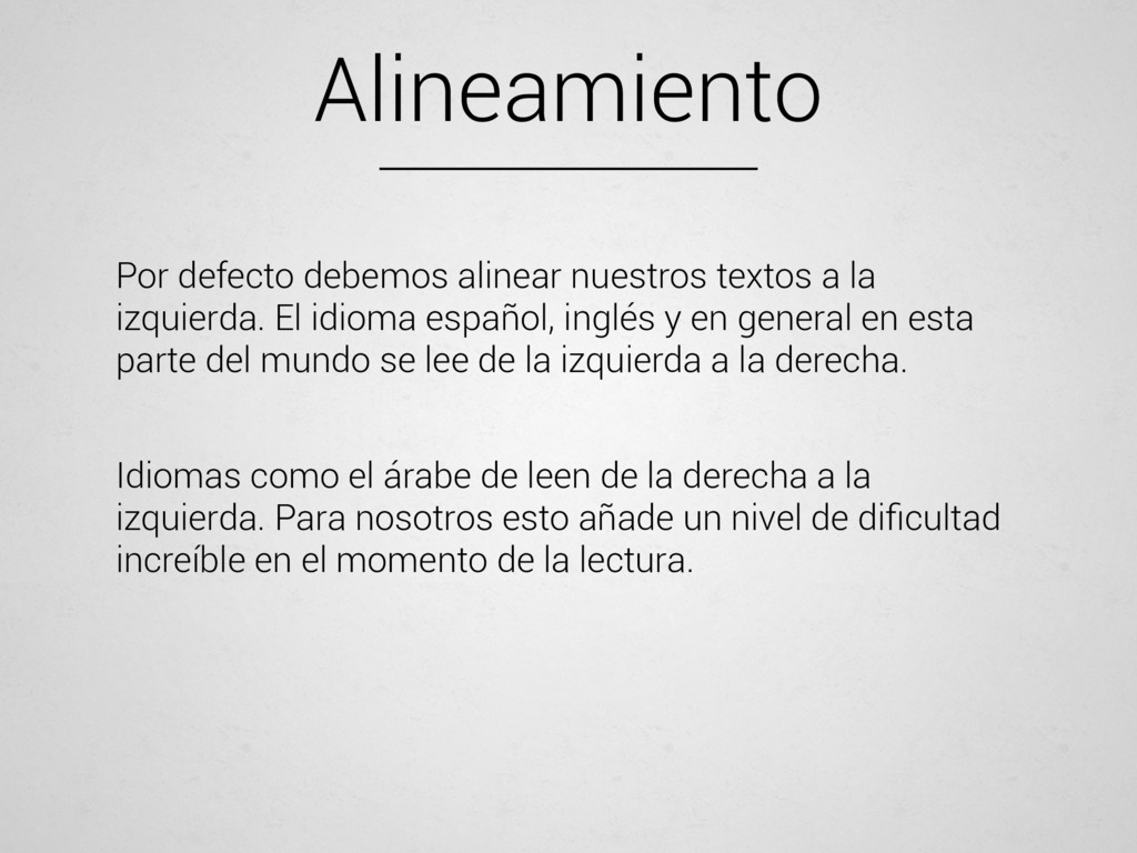 más difícil la lectura. Tampoco usemos texto justificado. Al justificar nuestros párrafos creamos espacios extra o ficticios entre nuestra tipografía para forzar que todo el texto se alinee a un bloque igual.