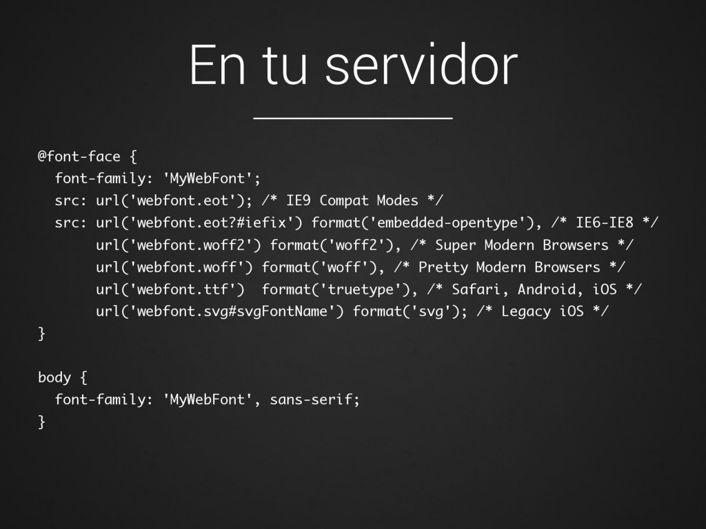 app. Para tener todos los formatos necesarios, pueden usar un generador de tipografías web. ex. http://www.fontsquirrel.com/tools/webfont-generator https://fontie.flowyapps.com/home