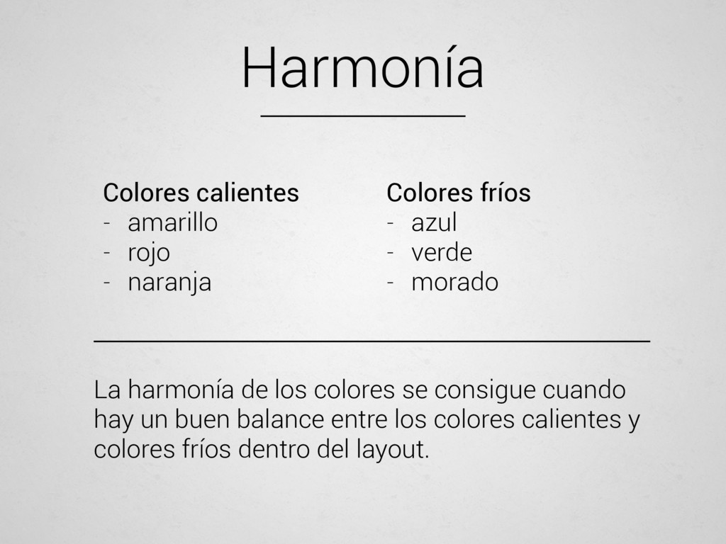 fríos - azul - verde - morado La harmonía de los colores se consigue cuando hay un buen balance entre los colores calientes y colores fríos dentro del layout.
