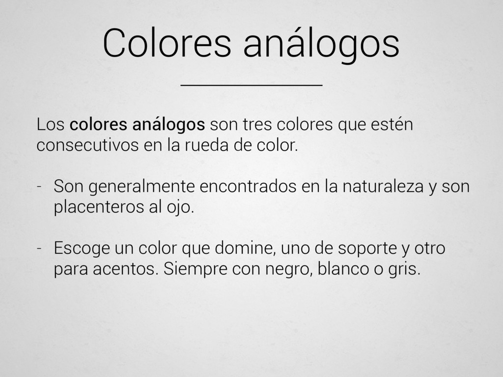 la rueda de color. - Son generalmente encontrados en la naturaleza y son placenteros al ojo. - Escoge un color que domine, uno de soporte y otro para acentos. Siempre con negro, blanco o gris. Colores análogos