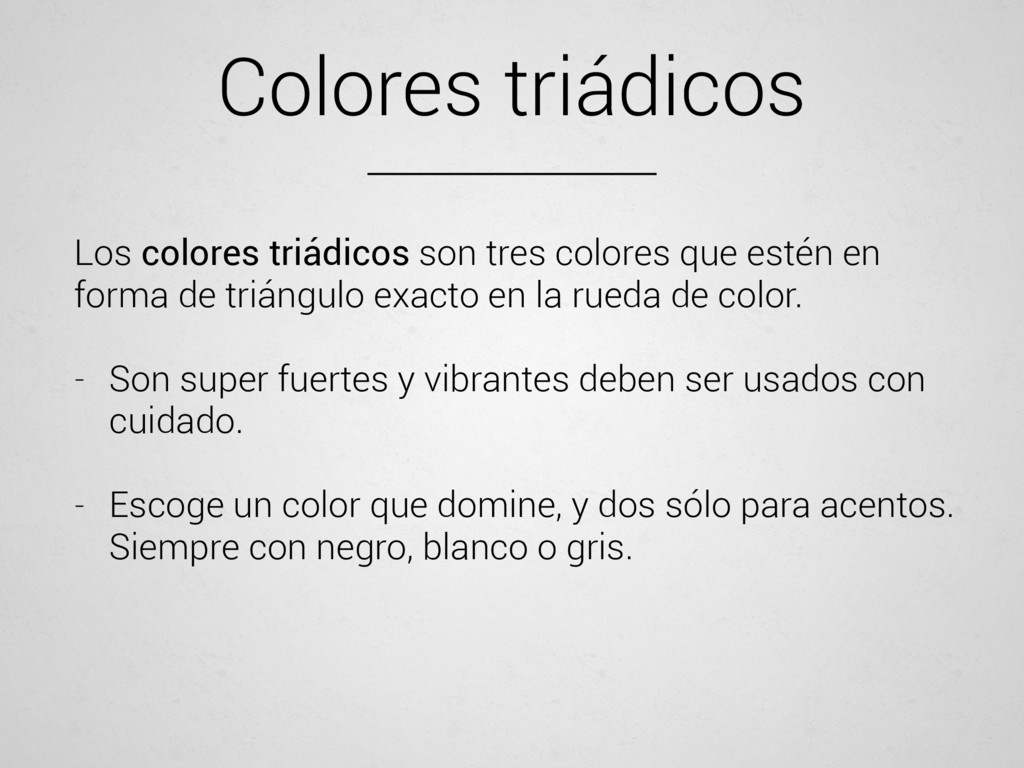 de triángulo exacto en la rueda de color. - Son super fuertes y vibrantes deben ser usados con cuidado. - Escoge un color que domine, y dos sólo para acentos. Siempre con negro, blanco o gris. Colores triádicos