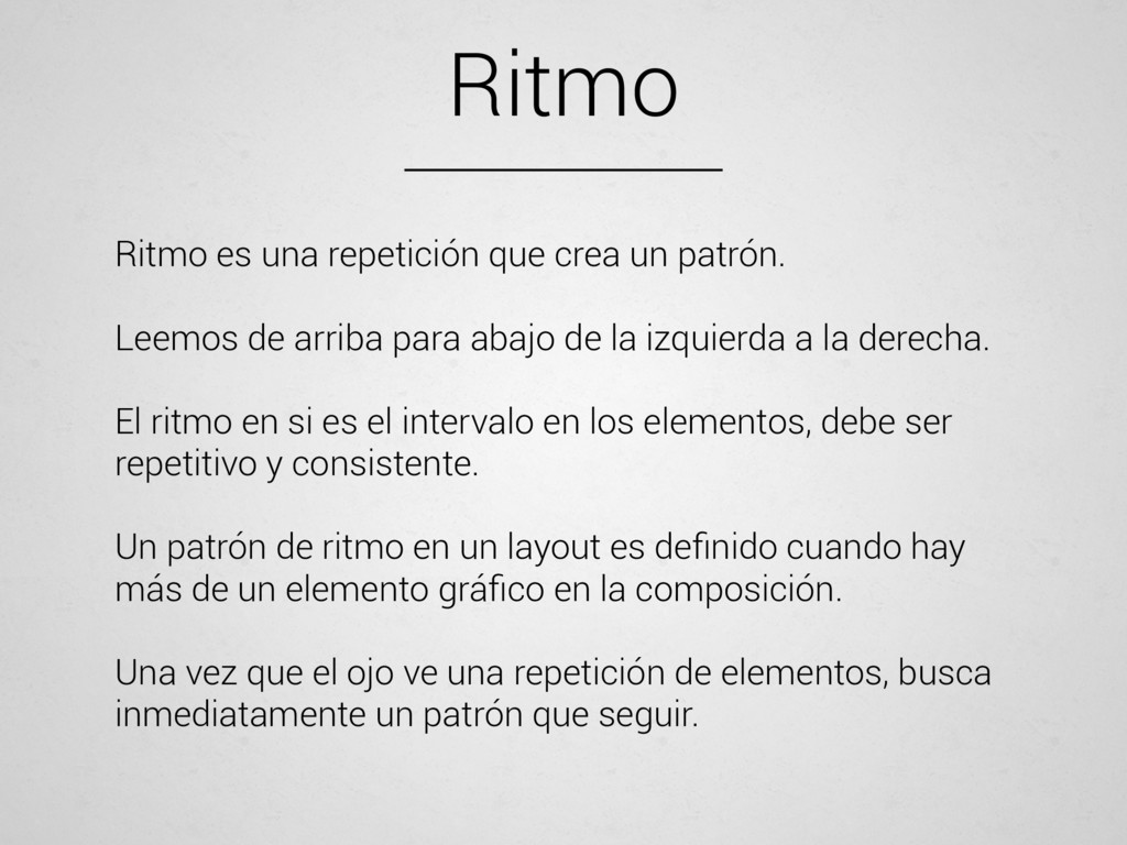 de arriba para abajo de la izquierda a la derecha. El ritmo en si es el intervalo en los elementos, debe ser repetitivo y consistente. Un patrón de ritmo en un layout es definido cuando hay más de un elemento gráfico en la composición. Una vez que el ojo ve una repetición de elementos, busca inmediatamente un patrón que seguir.