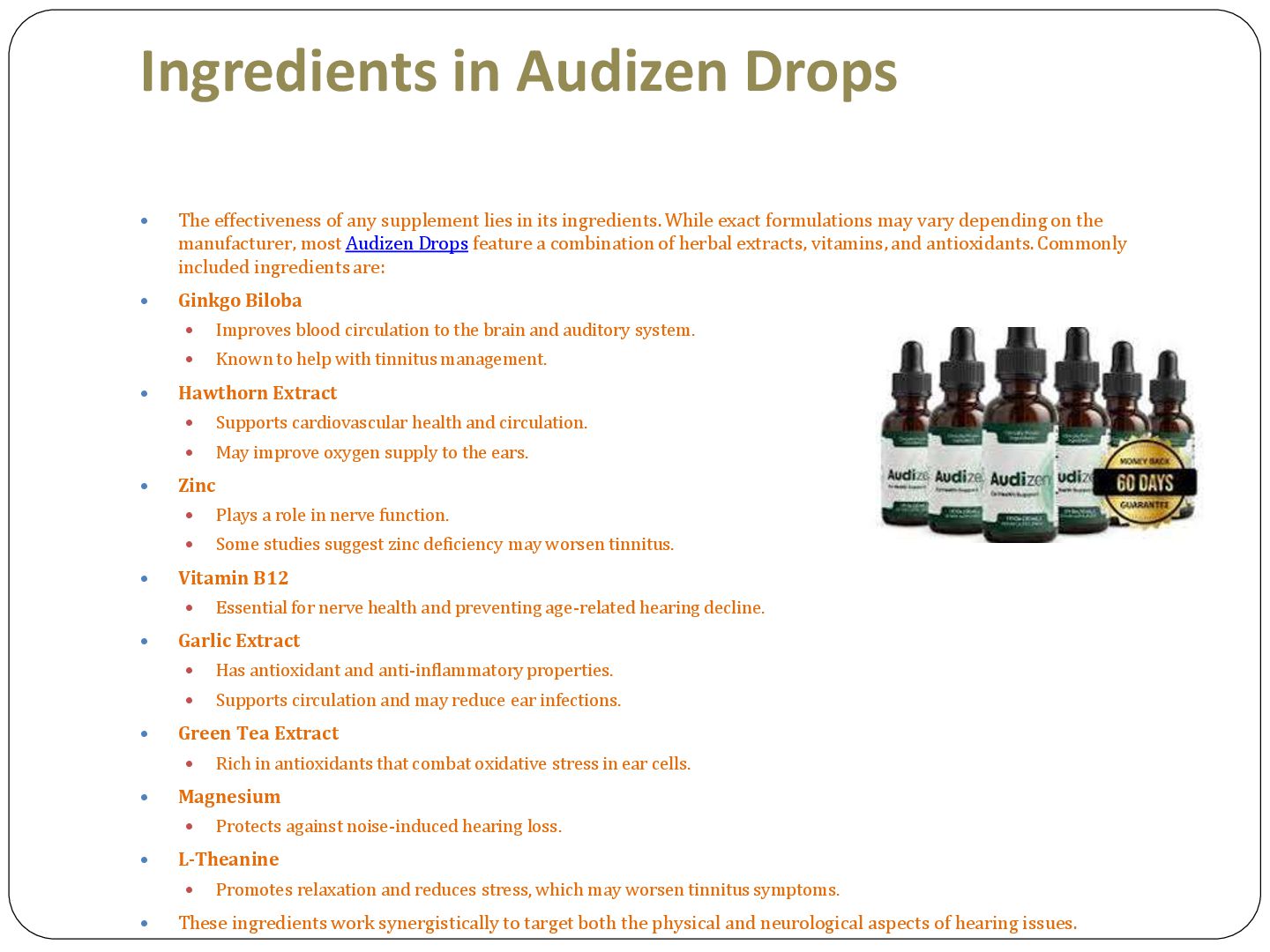 Audizen Drops is a dietary hearing support formula crafted from a blend of bioactive plant extracts, antioxidants, and minerals known to benefit the auditory system. The drops come in a liquid form, making them easy to absorb and fast-acting compared to traditional capsules.