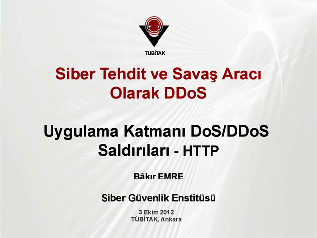 IP adresler kullanılarak, uygulama sunucusunun performans kısıtlarını hedef alır Ø HTTP GET Ø HTTP POST Ø DNS query flood Ø Düşük oranlı/sürekli paket ile DoS, Ø Slowloris, HTTP POST DoS vs Internet Hedef Sunucu Switch Router GD STS HTTP: GET / HTTP istek/saniye HTTP: 200 OK HTTP: 503 Service Unavailable