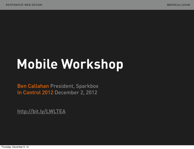 Mindset “The truly responsive design web designer wasn’t born until after the launch of the iPhone. We haven’t seen his or her work yet.” Andy Clarke http://the-pastry-box-project.net/andy-clarke/2012-april-8/ Thursday, December 6, 12