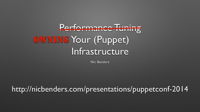 but this will work with Puppet Open Source, or with newer versions. You’ll just need to make a few changes here and there. • If you don’t have a New Relic account, you can sign-up for a free “Lite” account. • All of the examples are up in a more useful format at the URL below. (The URL will also be shown at the end of the presentation.) http://nicbenders.com/presentations/puppetconf-2014