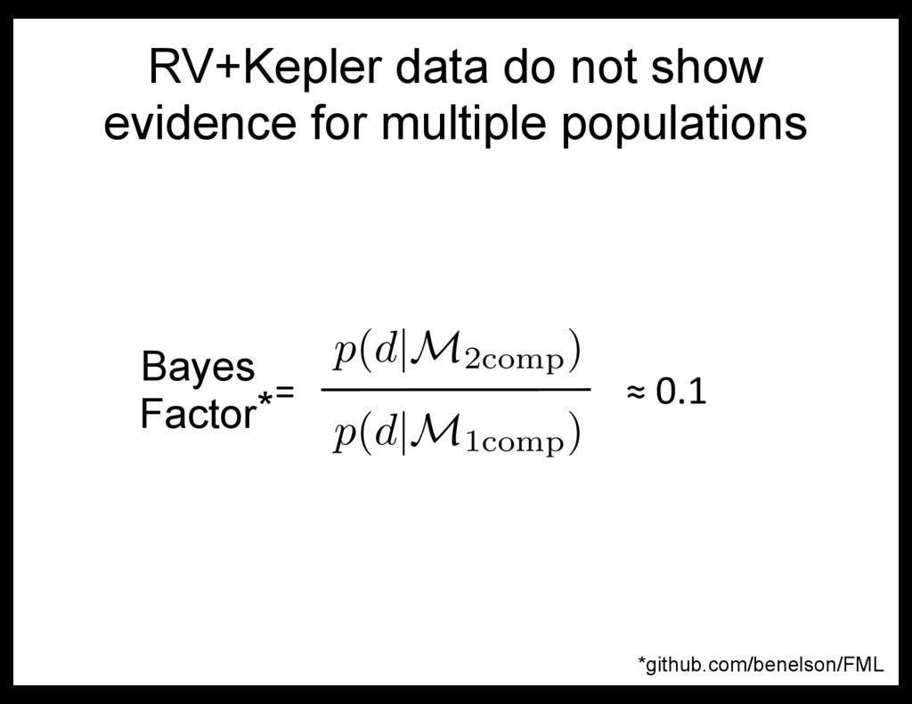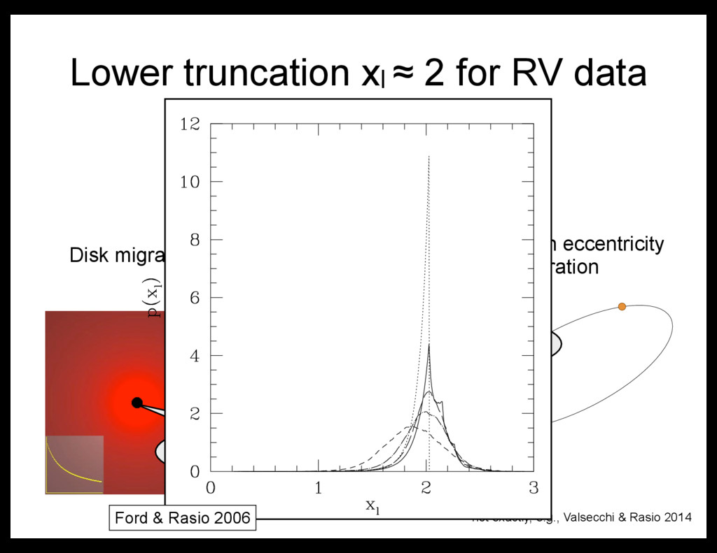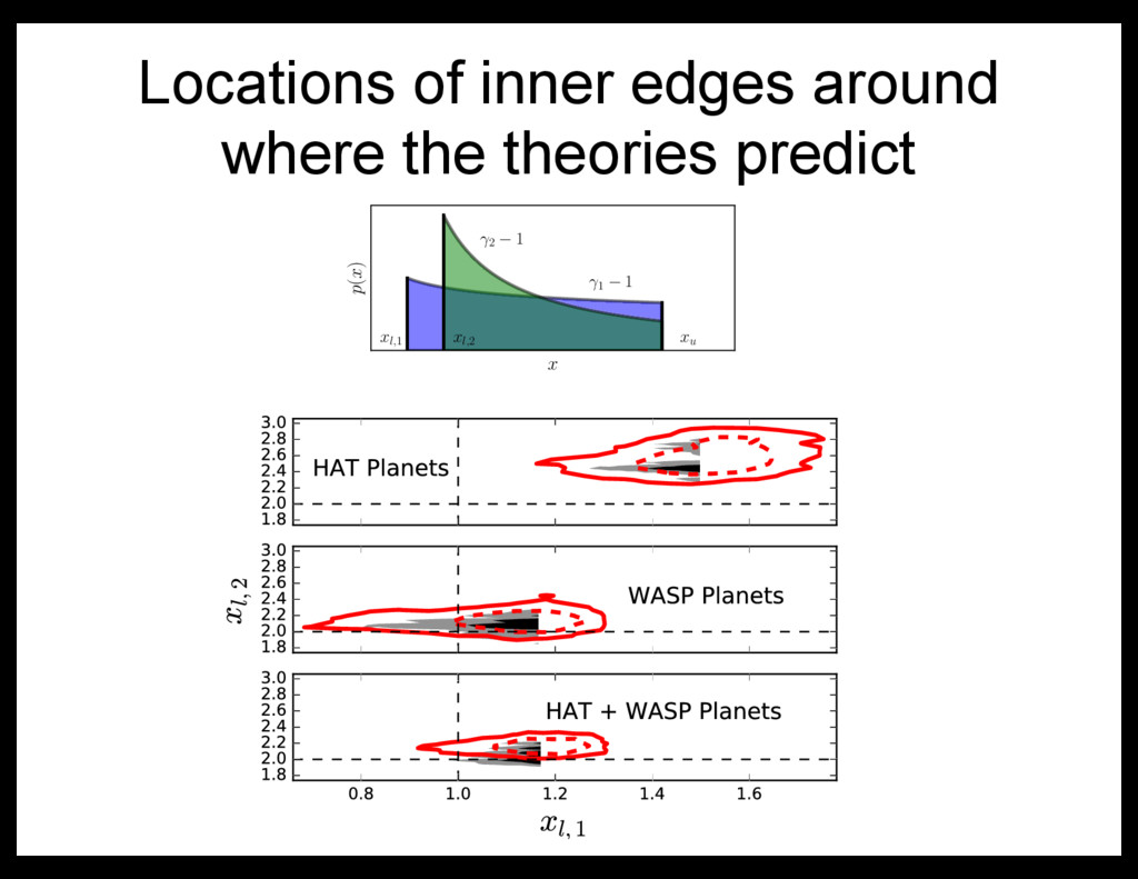 can be inferred from current data. RV+Kepler data are well explained as a single population with xl ≈ 2. For HAT+WASP data... 85% consistent with high-e migration history 15% consistent with disk migration history Caveats including but not limited to: 1. NASA Exoplanet Archive query missed some planets due to filtering issues; 2. similar analysis with exoplanets.org data show moderately different constraints on some pop-level parameters; 3. smaller sample size for RV and Kepler, more data could reveal 1<x<2 planets in these datasets; 4. we only include data on x, nothing on obliquity, additional companions, etc.; 5. unclear if HAT and WASP have significant observing biases affecting shape of x distribution; 6. large asymmetries in planet radius estimates not accurately modeled with Gaussian; 7. hard edge most sensitive to planet with smallest x, doesn’t offer enough flexibility for outliers * *
