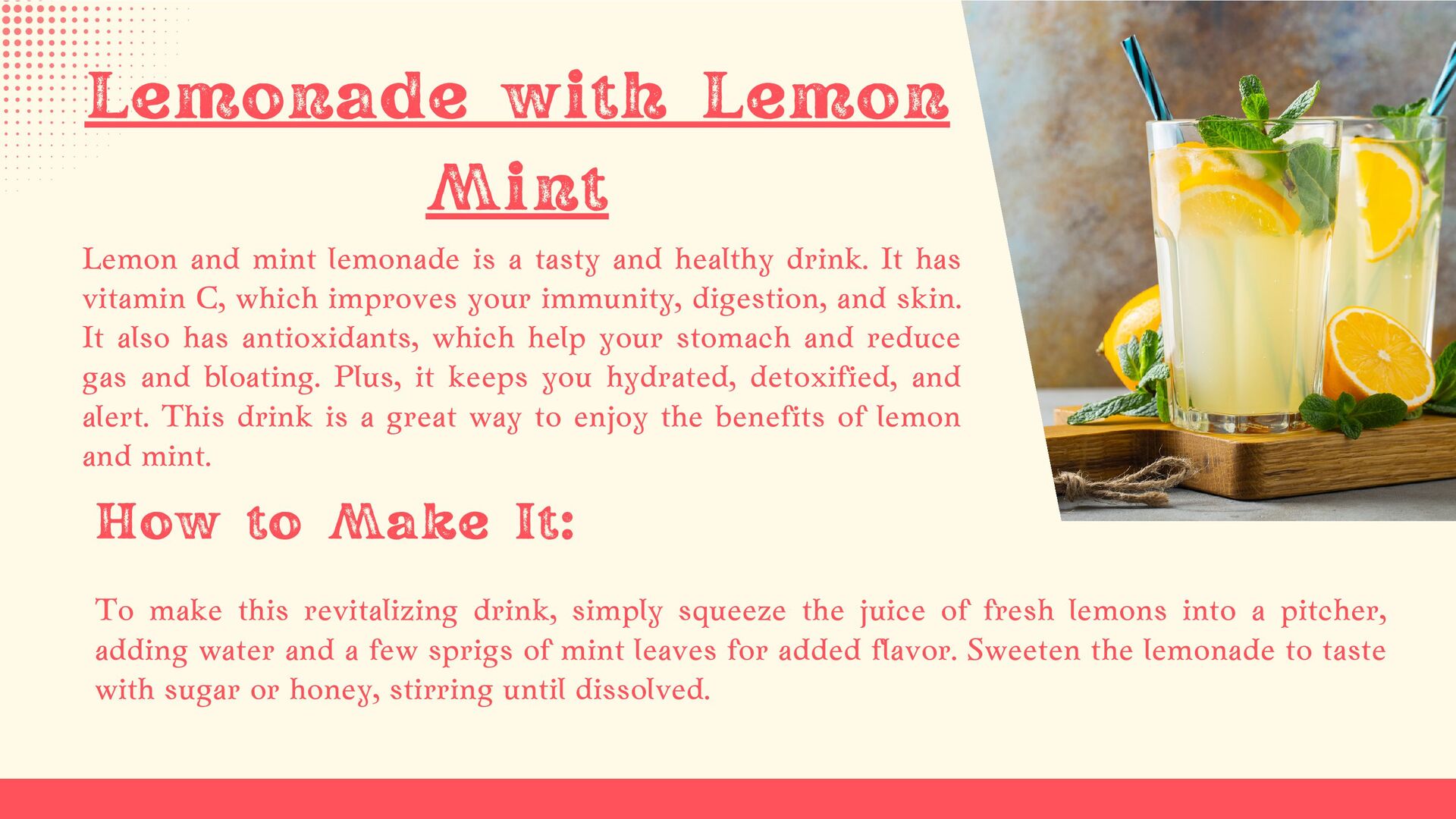 tasty and healthy drink. It has vitamin C, which improves your immunity, digestion, and skin. It also has antioxidants, which help your stomach and reduce gas and bloating. Plus, it keeps you hydrated, detoxified, and alert. This drink is a great way to enjoy the benefits of lemon and mint. To make this revitalizing drink, simply squeeze the juice of fresh lemons into a pitcher, adding water and a few sprigs of mint leaves for added flavor. Sweeten the lemonade to taste with sugar or honey, stirring until dissolved. How to Make It: