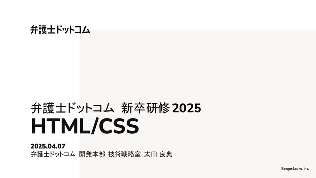 2025年入社の新卒エンジニア向けに実施した研修「HTML/CSS」の資料です。弁護士ドットコム株式会社 開発本部 技術戦略室の太田良典が講師として登壇しました。