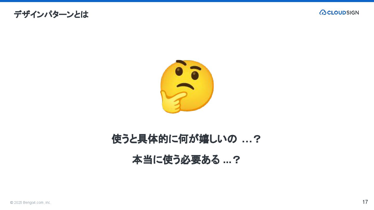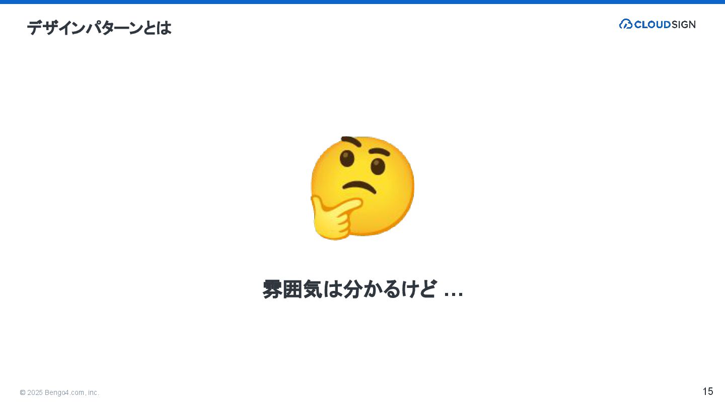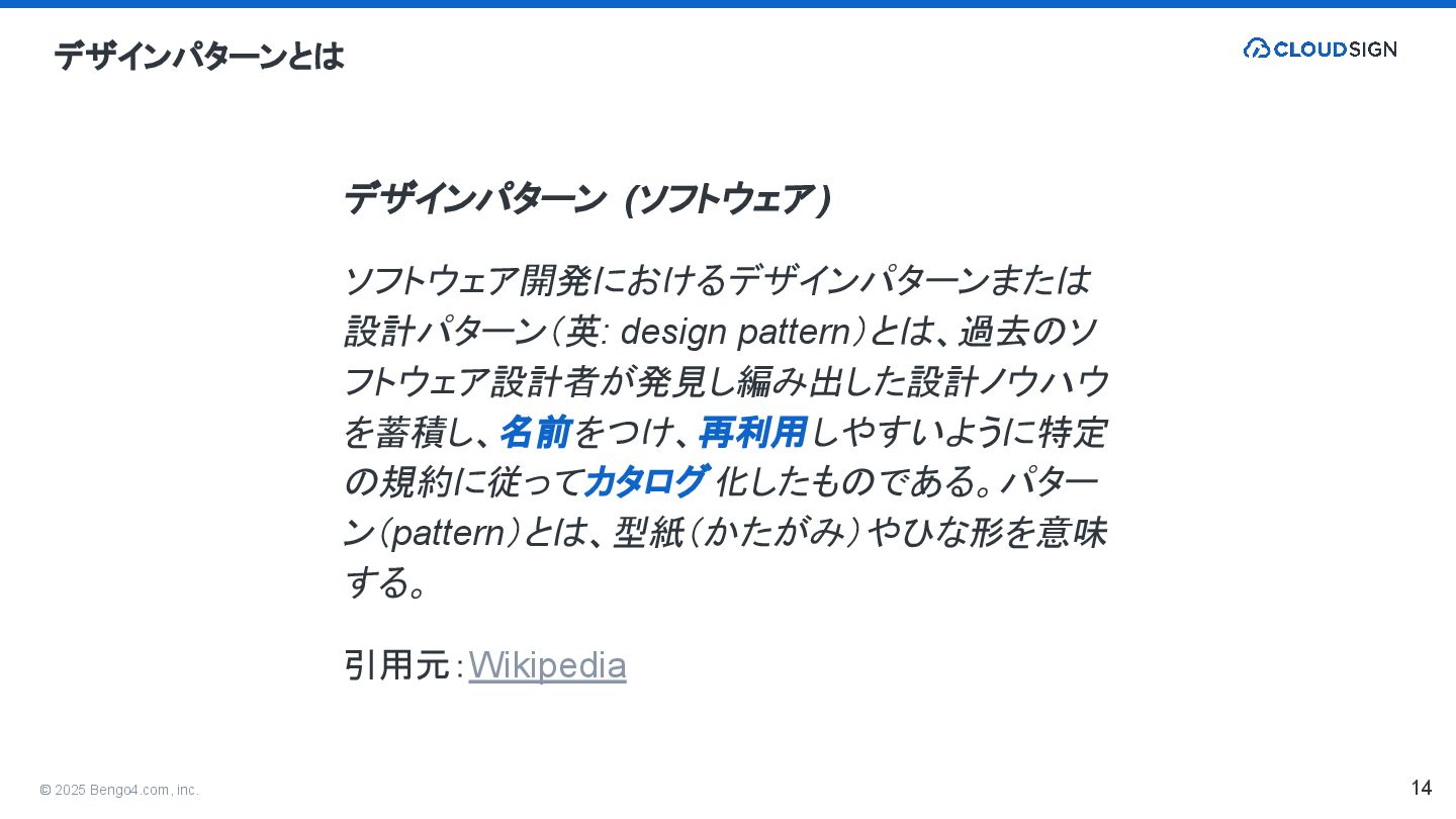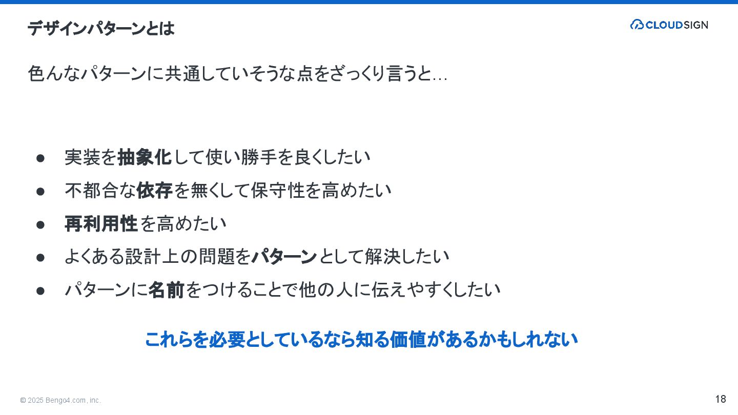 9. © 2025 Bengo4.com, inc. デザインパターンとは 色んなパターンに共通していそうな点をざっくり言うと… • 実装を抽象化して使い勝手を良くしたい • 不都合な依存を無くして保守性を高めたい