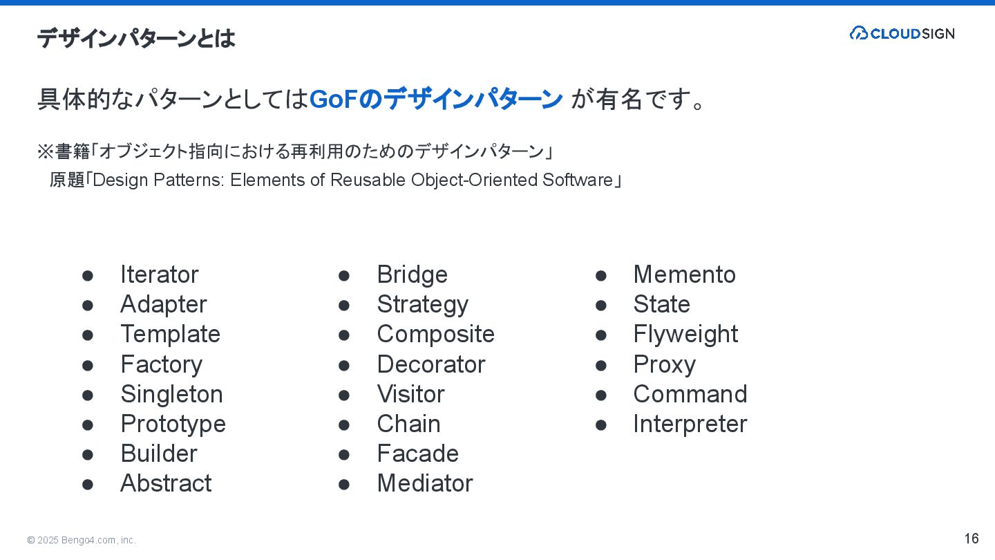 8. © 2025 Bengo4.com, inc. デザインパターンとは 具体的なパターンとしてはGoFのデザインパターン が有名です。 ※書籍「オブジェクト指向における再利用のためのデザインパターン」  原題「Design Patterns: