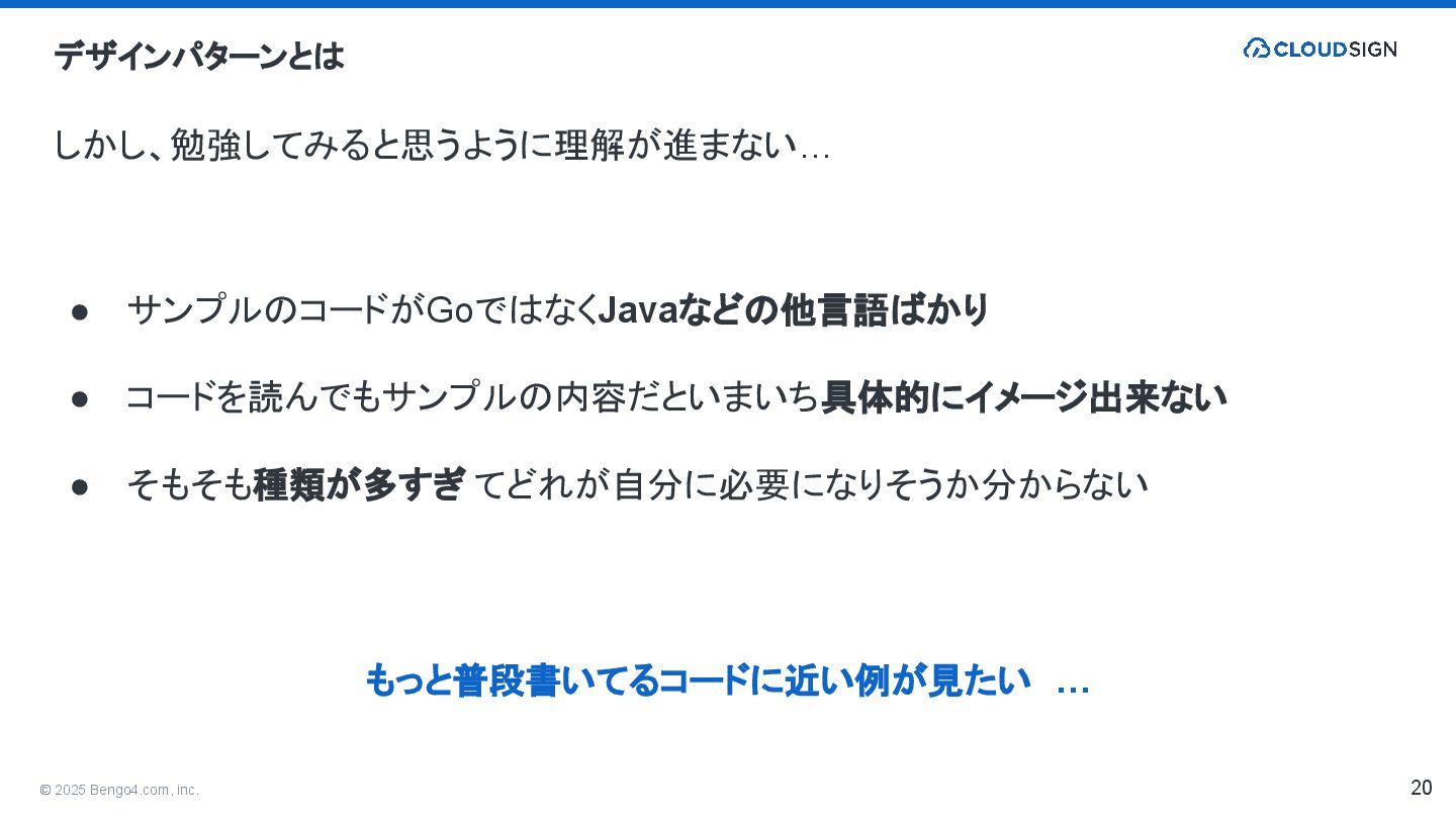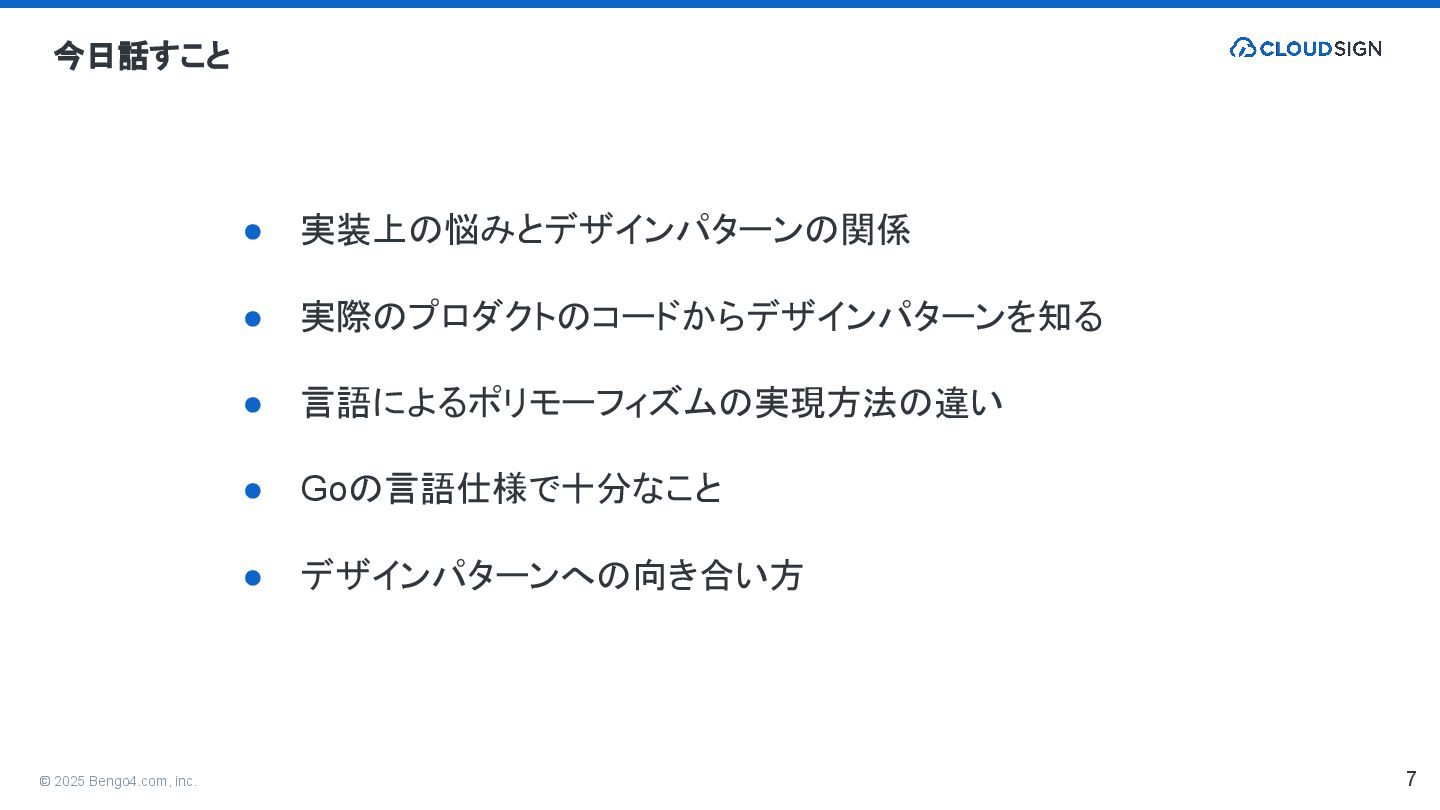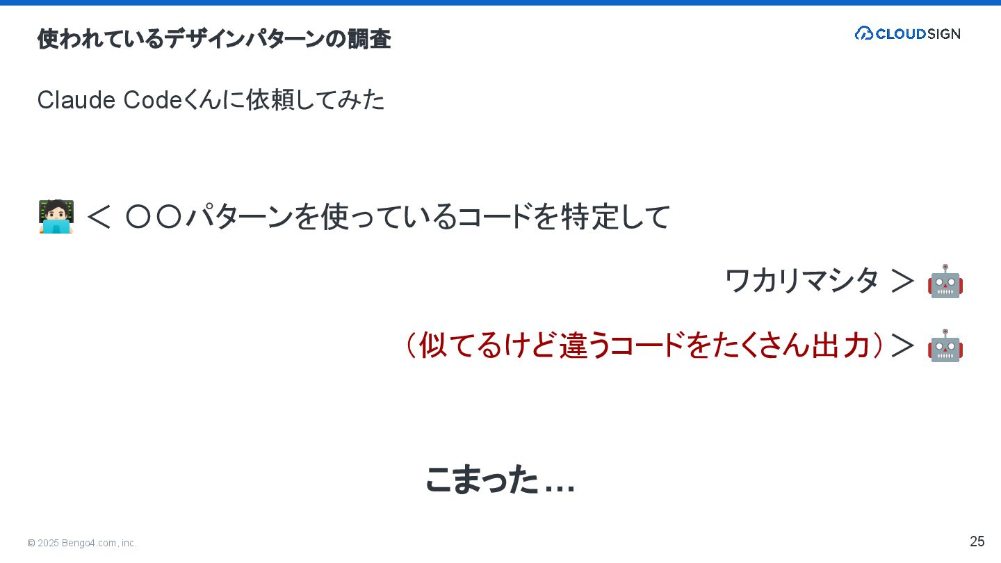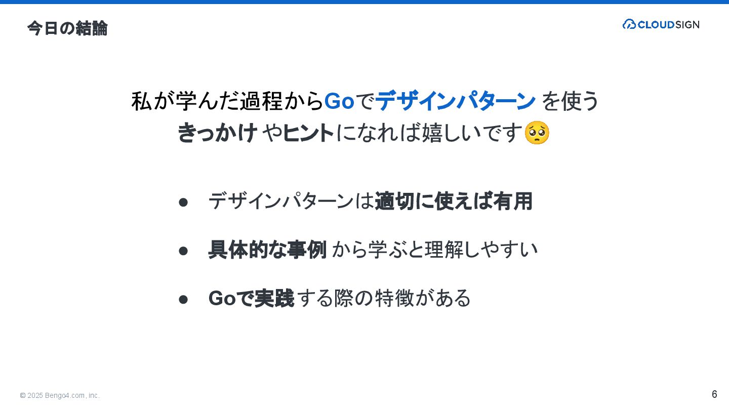 4. © 2025 Bengo4.com, inc. 今日の結論 • デザインパターンは適切に使えば有用 • 具体的な事例 から学ぶと理解しやすい