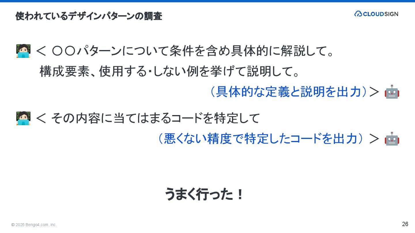 (具体的な定義と説明を出力)> 🤖 󰱢 < その内容に当てはまるコードを特定して (悪くない精度で特定したコードを出力) > 🤖 うまく行った! 26
