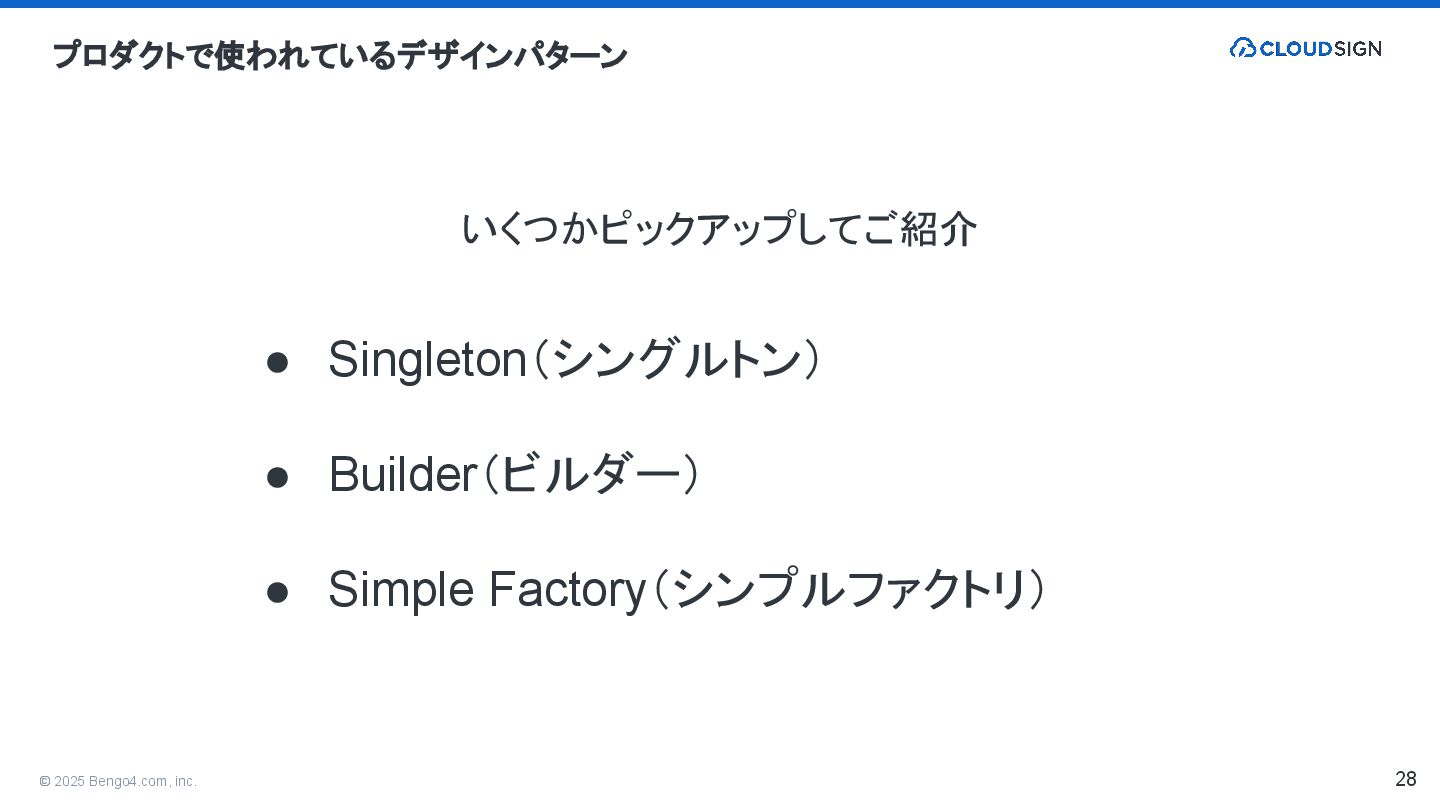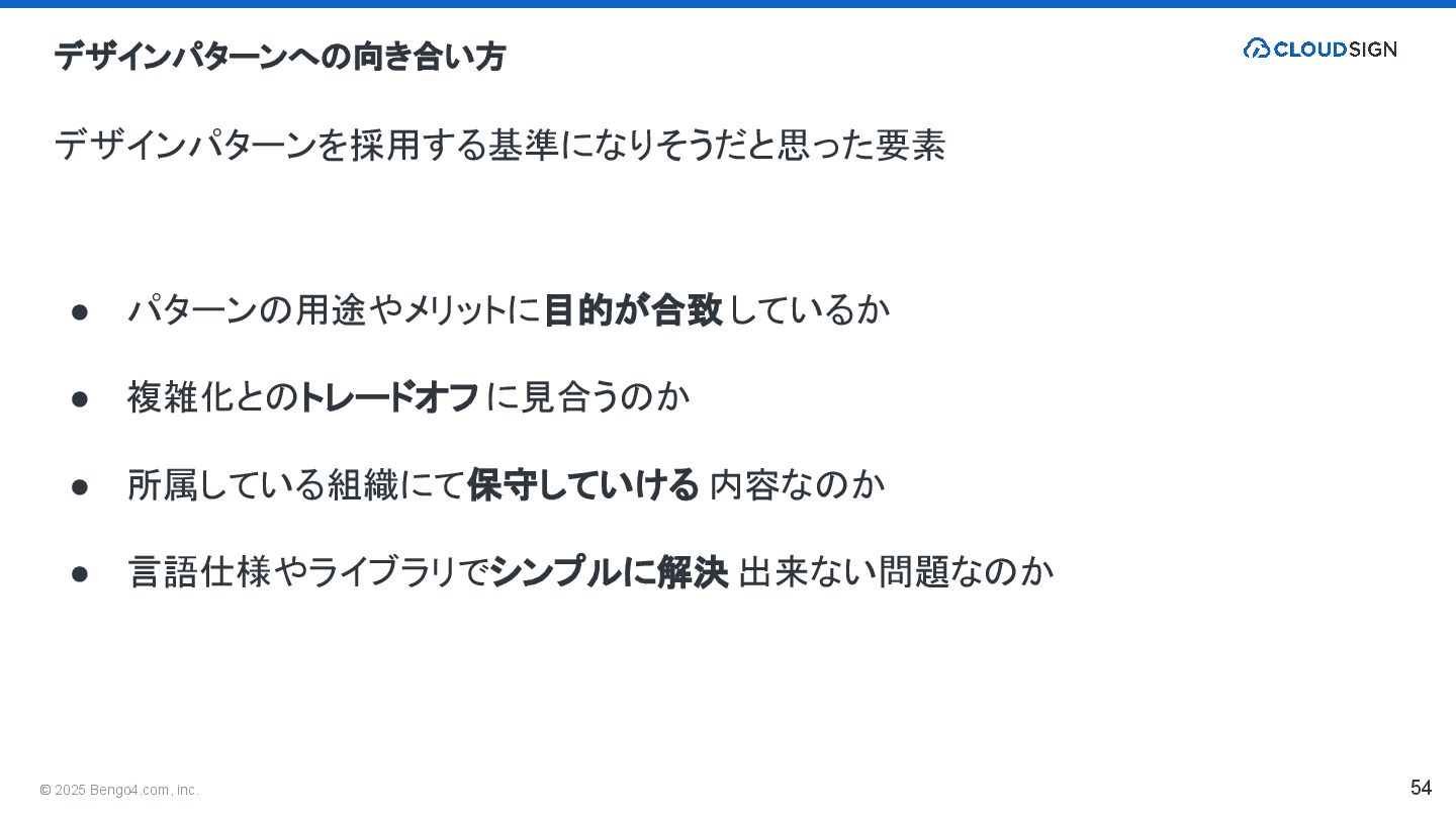 27. © 2025 Bengo4.com, inc. デザインパターンへの向き合い方 デザインパターンを採用する基準になりそうだと思った要素 • パターンの用途やメリットに目的が合致 しているか •