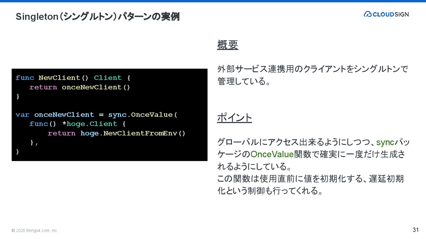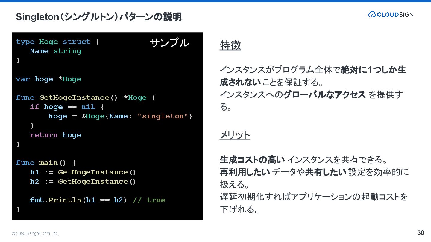 12. © 2025 Bengo4.com, inc. Singleton(シングルトン)パターンの説明 30 type Hoge struct {