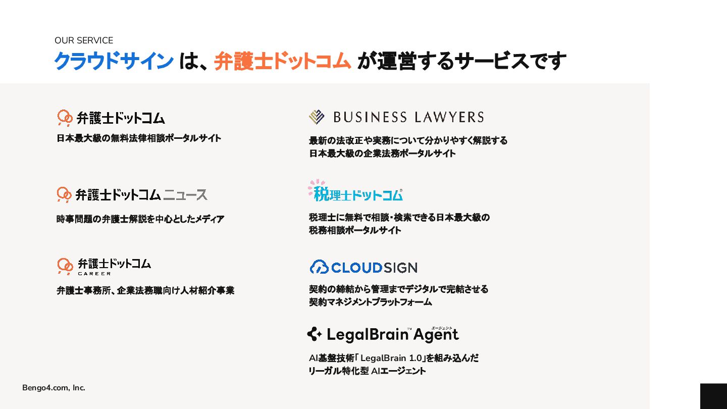 2. Bengo4.com, Inc. クラウドサイン は、弁護士ドットコム が運営するサービスです OUR SERVICE 4 税理士に無料で相談・検索できる日本最大級の 税務相談ポータルサイト