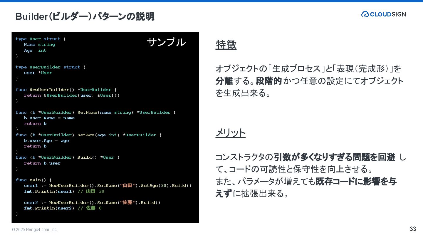 14. © 2025 Bengo4.com, inc. Builder(ビルダー)パターンの説明 33 type User struct {