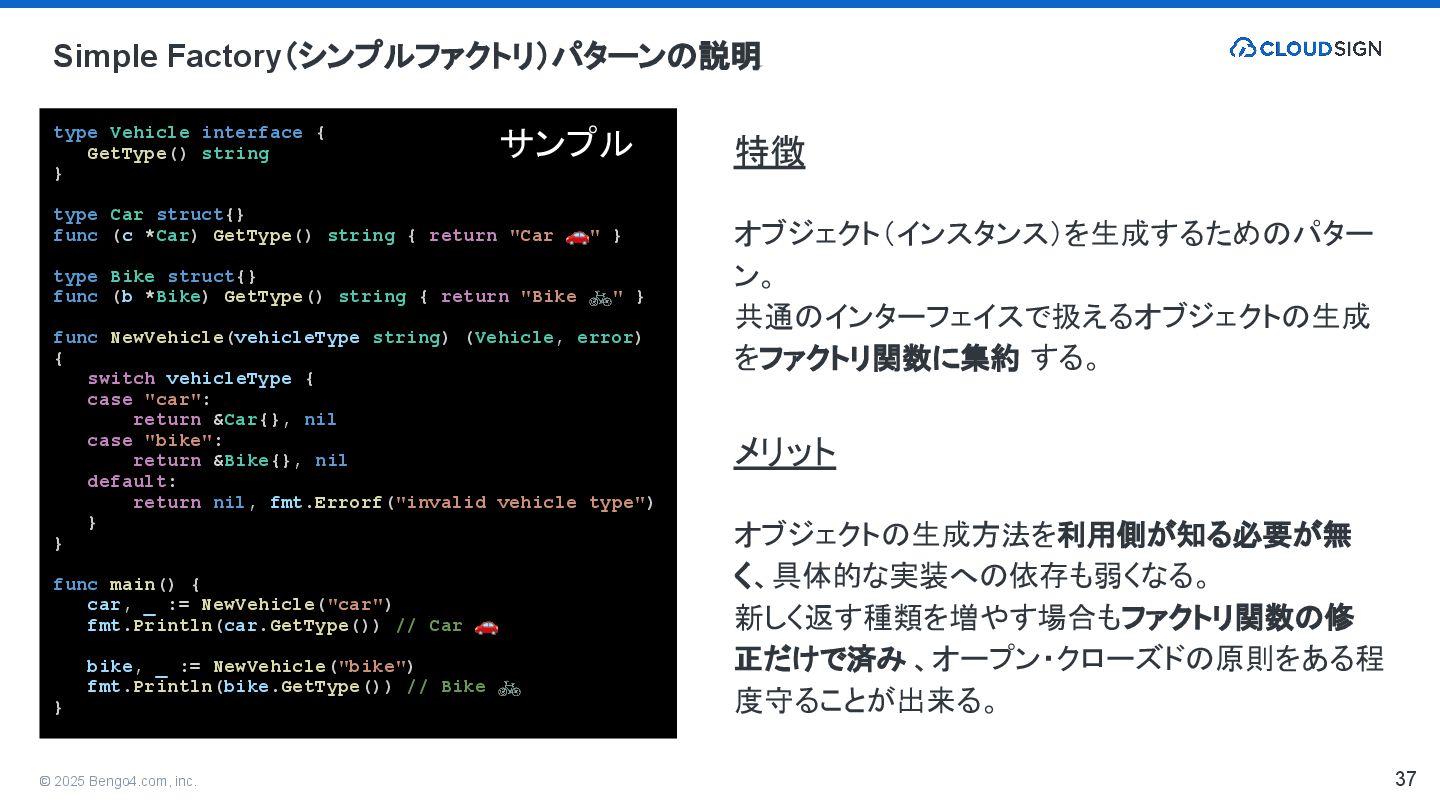 17. © 2025 Bengo4.com, inc. Simple Factory(シンプルファクトリ)パターンの説明 37 type Vehicle interface