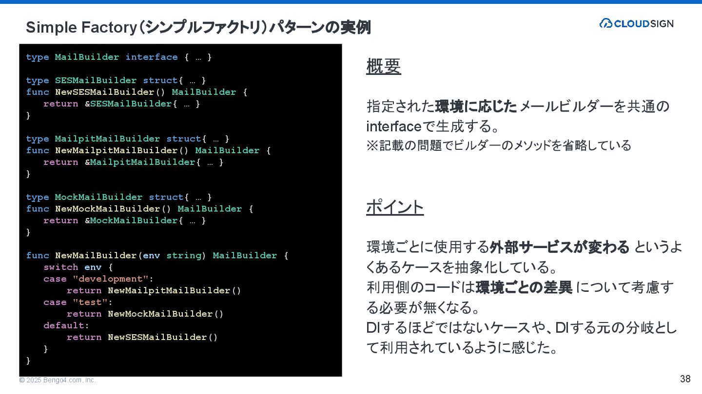 { … } type SESMailBuilder struct{ … } func NewSESMailBuilder() MailBuilder { return &SESMailBuilder{ … } } type MailpitMailBuilder struct{ … } func NewMailpitMailBuilder() MailBuilder { return &MailpitMailBuilder{ … } } type MockMailBuilder struct{ … } func NewMockMailBuilder() MailBuilder { return &MockMailBuilder{ … } } func NewMailBuilder(env string) MailBuilder { switch env { case "development": return NewMailpitMailBuilder() case "test": return NewMockMailBuilder() default: return NewSESMailBuilder() } } 概要 指定された環境に応じた メールビルダーを共通の interfaceで生成する。 ※記載の問題でビルダーのメソッドを省略している ポイント 環境ごとに使用する外部サービスが変わる というよ くあるケースを抽象化している。 利用側のコードは環境ごとの差異 について考慮す る必要が無くなる。 DIするほどではないケースや、DIする元の分岐とし て利用されているように感じた。
