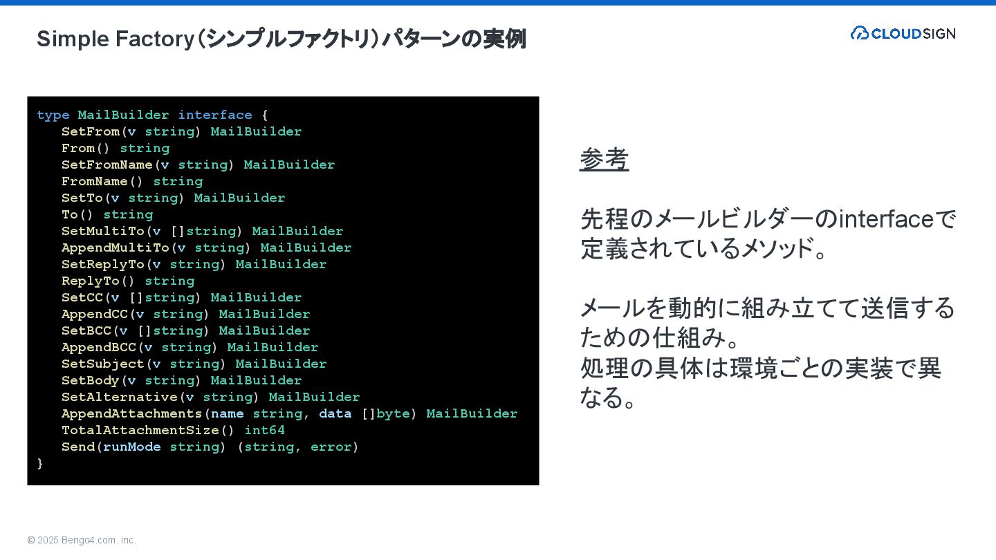 19. © 2025 Bengo4.com, inc. Simple Factory(シンプルファクトリ)パターンの実例 type MailBuilder interface {