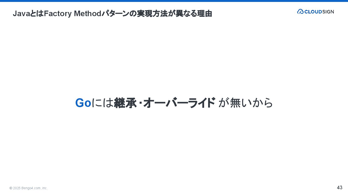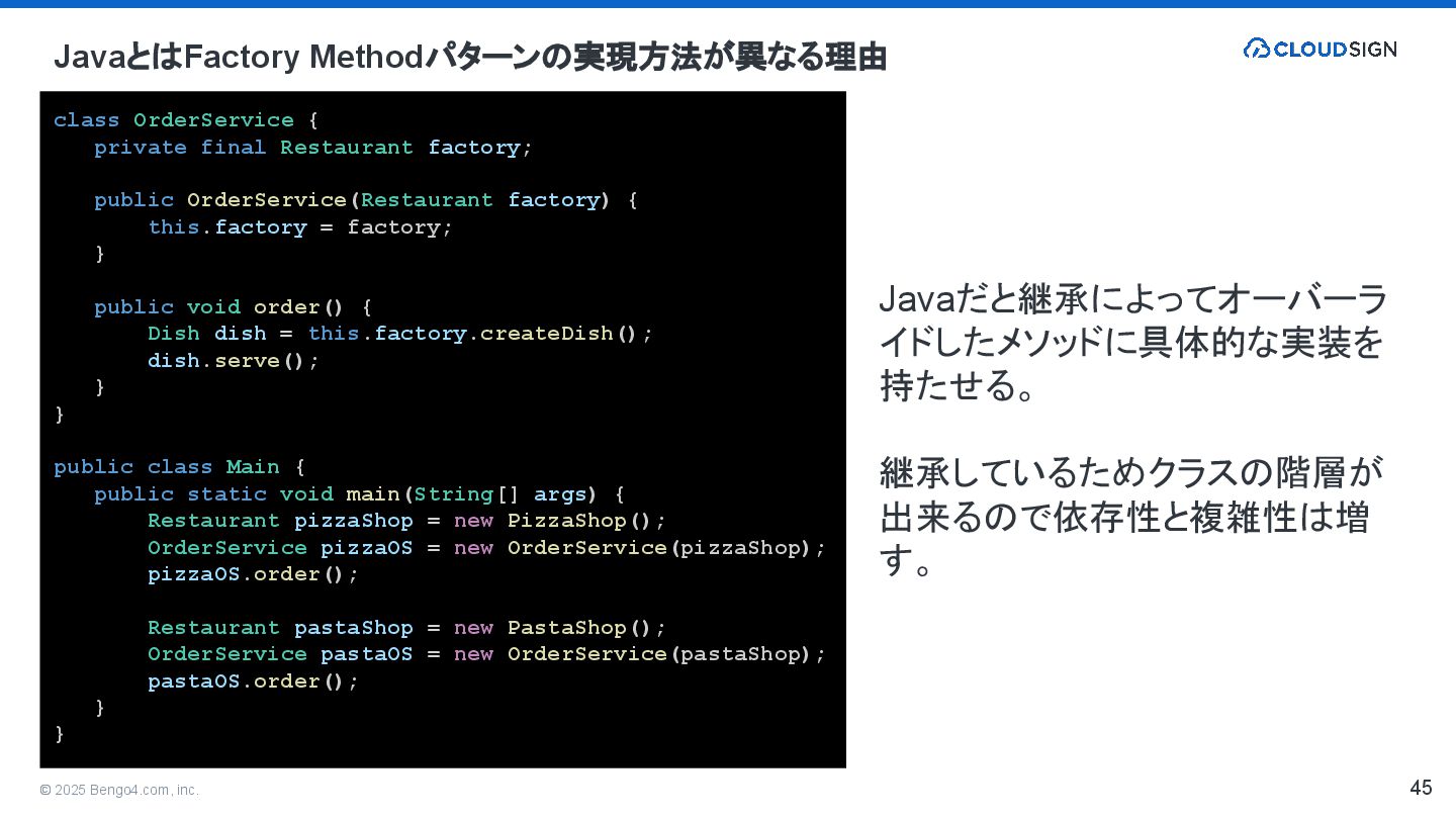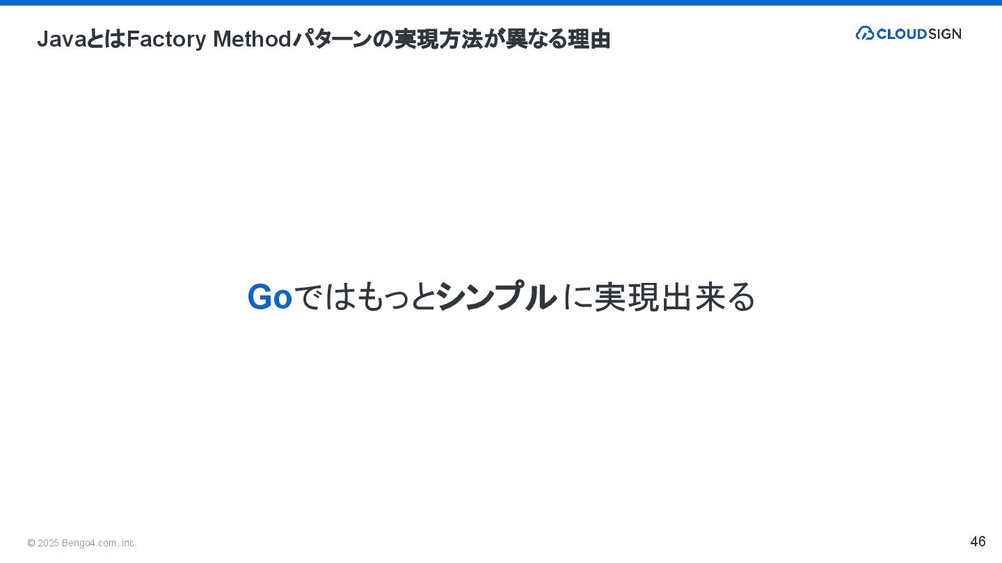21. © 2025 Bengo4.com, inc. JavaとはFactory Methodパターンの実現方法が異なる理由 45 Javaだと継承によってオーバーラ イドしたメソッドに具体的な実装を 持たせる。