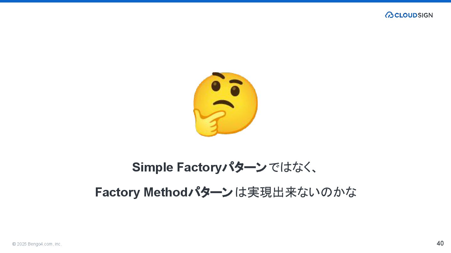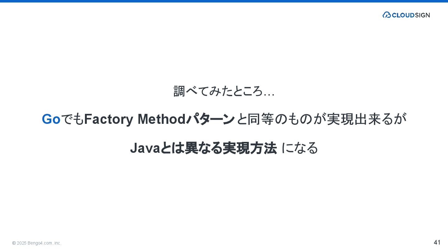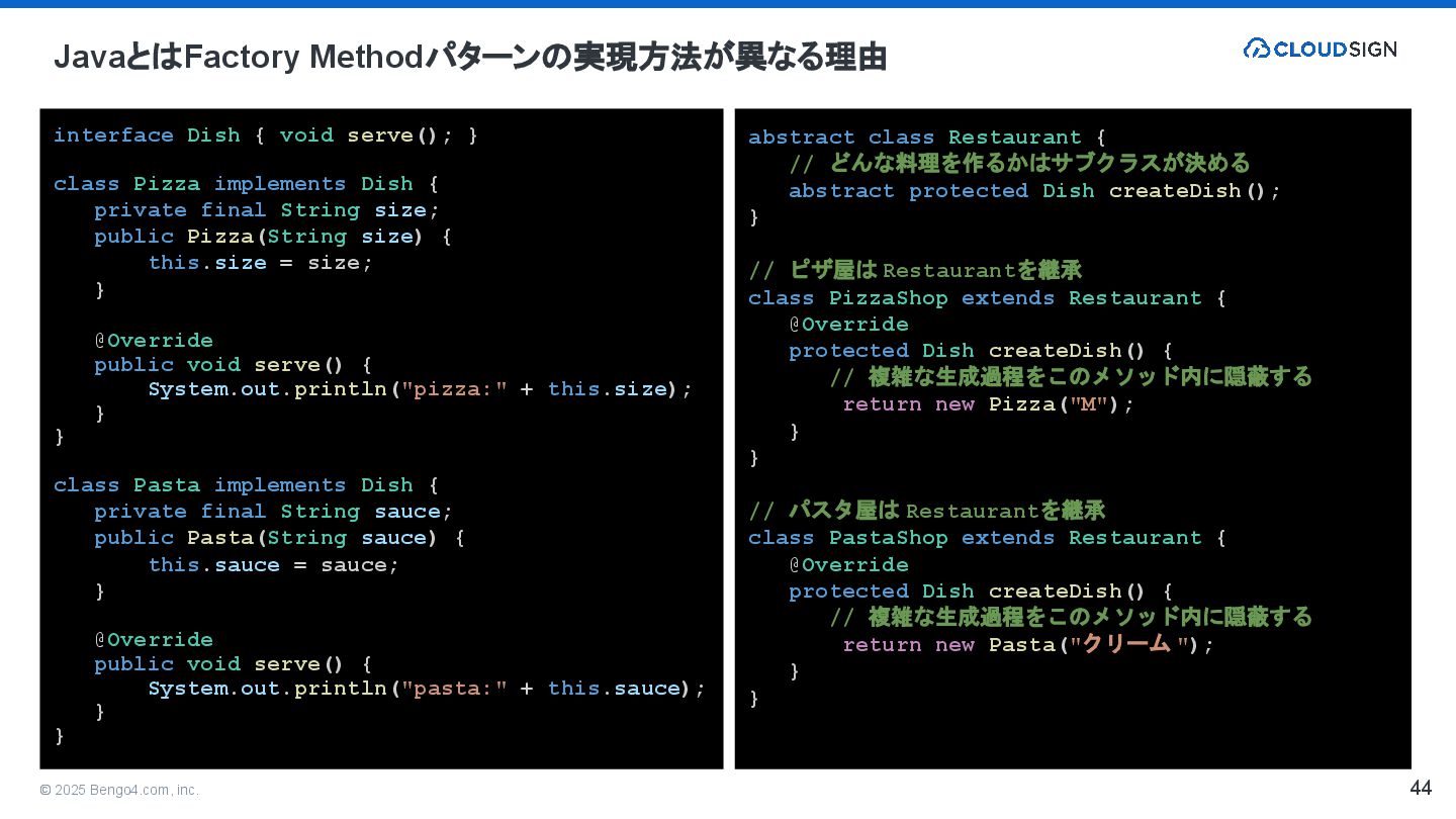 21. © 2025 Bengo4.com, inc. JavaとはFactory Methodパターンの実現方法が異なる理由 45 Javaだと継承によってオーバーラ イドしたメソッドに具体的な実装を 持たせる。
