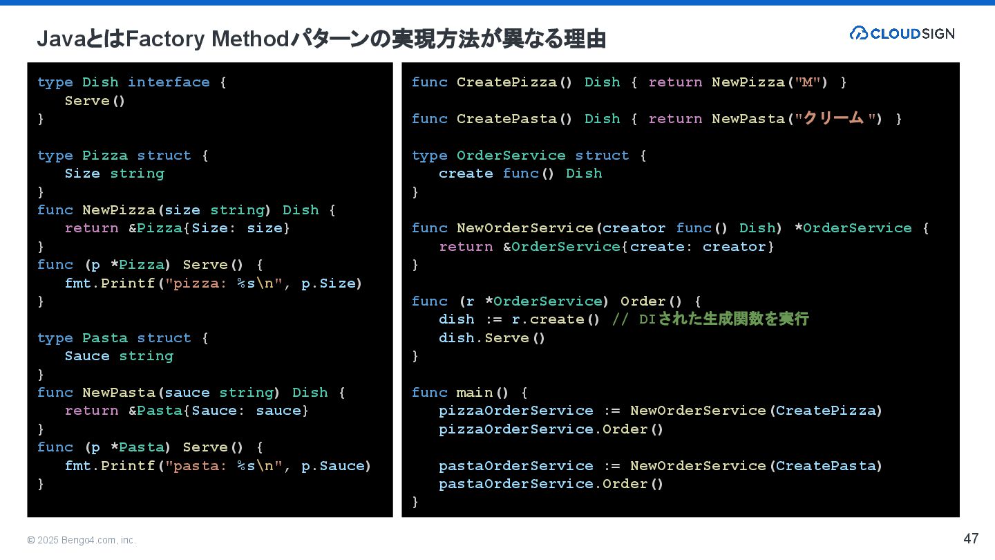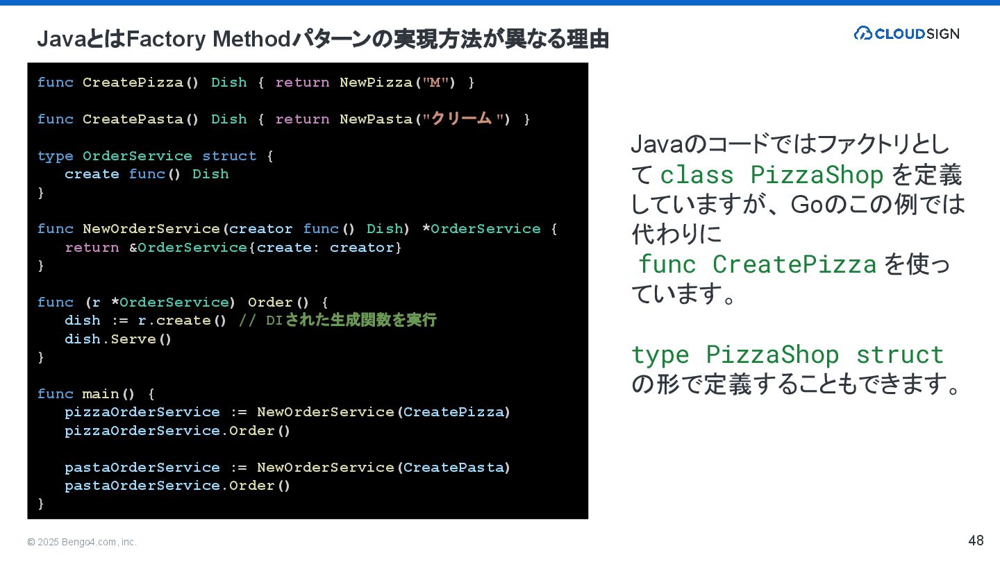 } func CreatePasta() Dish { return NewPasta("クリーム ") } type OrderService struct { create func() Dish } func NewOrderService(creator func() Dish) *OrderService { return &OrderService{create: creator} } func (r *OrderService) Order() { dish := r.create() // DIされた生成関数を実行 dish.Serve() } func main() { pizzaOrderService := NewOrderService(CreatePizza) pizzaOrderService.Order() pastaOrderService := NewOrderService(CreatePasta) pastaOrderService.Order() } JavaとはFactory Methodパターンの実現方法が異なる理由 47 type Dish interface { Serve() } type Pizza struct { Size string } func NewPizza(size string) Dish { return &Pizza{Size: size} } func (p *Pizza) Serve() { fmt.Printf("pizza: %s\n", p.Size) } type Pasta struct { Sauce string } func NewPasta(sauce string) Dish { return &Pasta{Sauce: sauce} } func (p *Pasta) Serve() { fmt.Printf("pasta: %s\n", p.Sauce) }