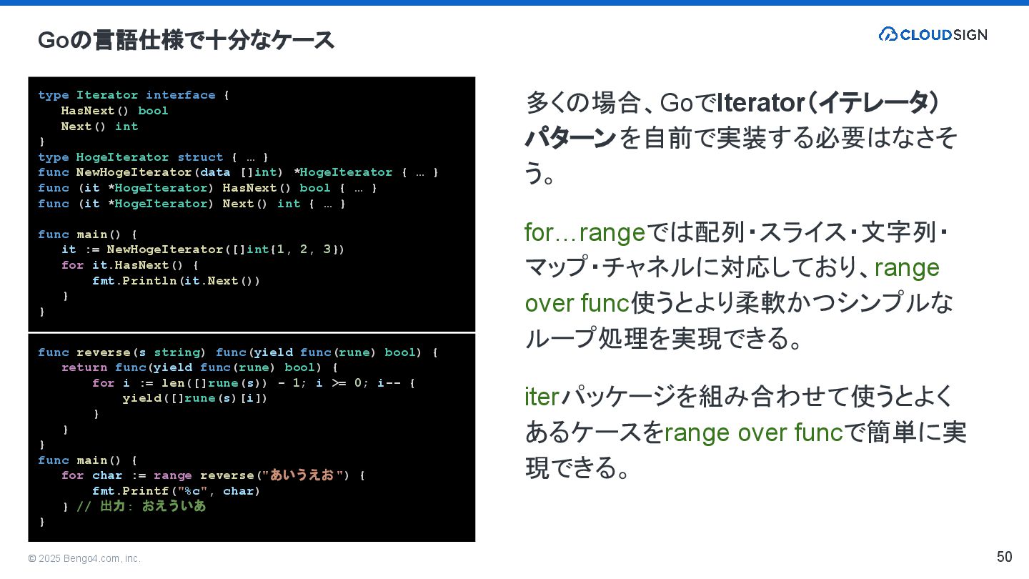 24. © 2025 Bengo4.com, inc. Goの言語仕様で十分なケース 多くの場合、GoでIterator(イテレータ) パターンを自前で実装する必要はなさそ う。 for…rangeでは配列・スライス・文字列・ マップ・チャネルに対応しており、range