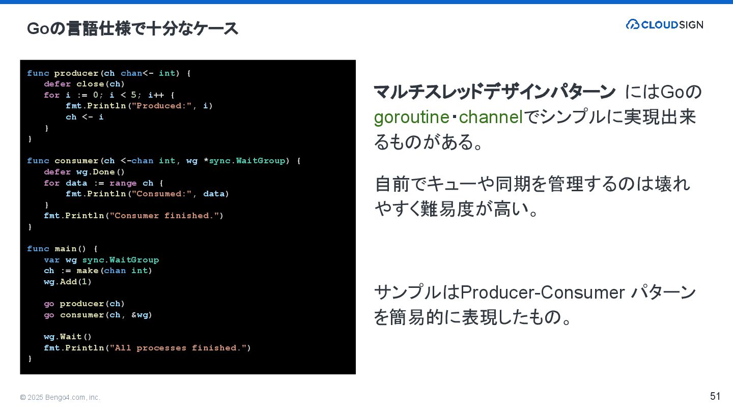 25. © 2025 Bengo4.com, inc. Goの言語仕様で十分なケース マルチスレッドデザインパターン にはGoの goroutine・channelでシンプルに実現出来 るものがある。 自前でキューや同期を管理するのは壊れ