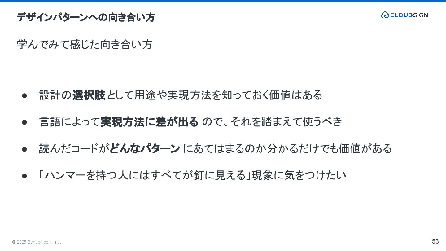 26. © 2025 Bengo4.com, inc. デザインパターンへの向き合い方 学んでみて感じた向き合い方 • 設計の選択肢として用途や実現方法を知っておく価値はある • 言語によって実現方法に差が出る