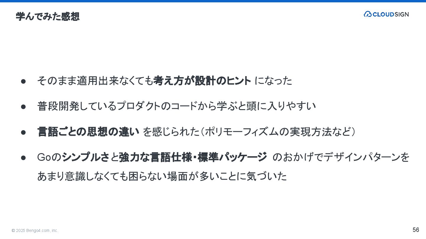 • 言語ごとの思想の違い を感じられた(ポリモーフィズムの実現方法など) • Goのシンプルさ と強力な言語仕様・標準パッケージ のおかげでデザインパターンを あまり意識しなくても困らない場面が多いことに気づいた 56