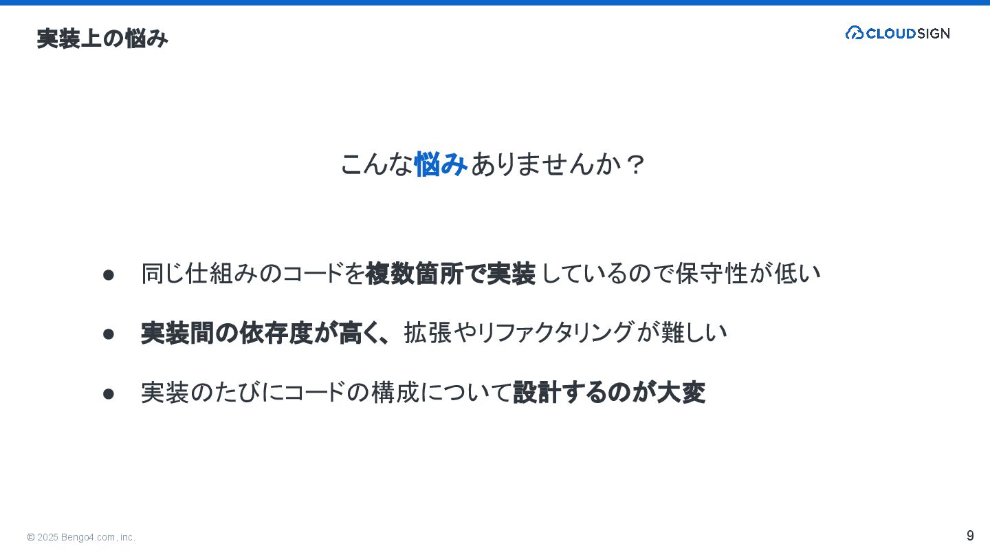 6. © 2025 Bengo4.com, inc. 実装上の悩み こんな悩みありませんか? 9 • 同じ仕組みのコードを複数箇所で実装 しているので保守性が低い