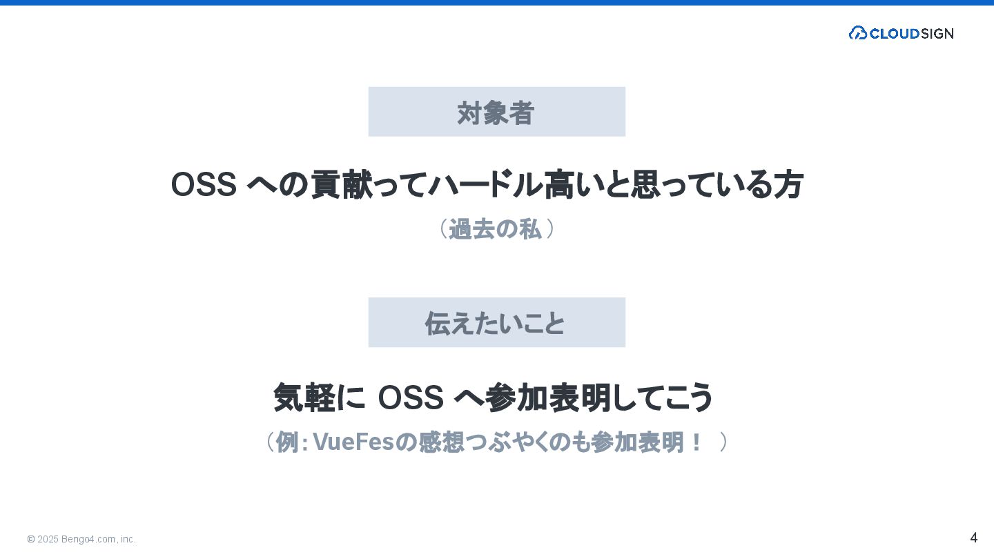 1. © 2025 Bengo4.com, inc. 4 対象者 OSS への貢献ってハードル高いと思っている方 (過去の私) 伝えたいこと