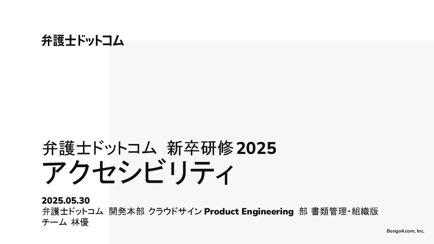 2025年入社の新卒エンジニア向けに実施した研修「アクセシビリティ」の資料です。弁護士ドットコム 開発本部 クラウドサインProduct Engineering部 書類管理・組織版チーム 林優が講師として登壇しました。