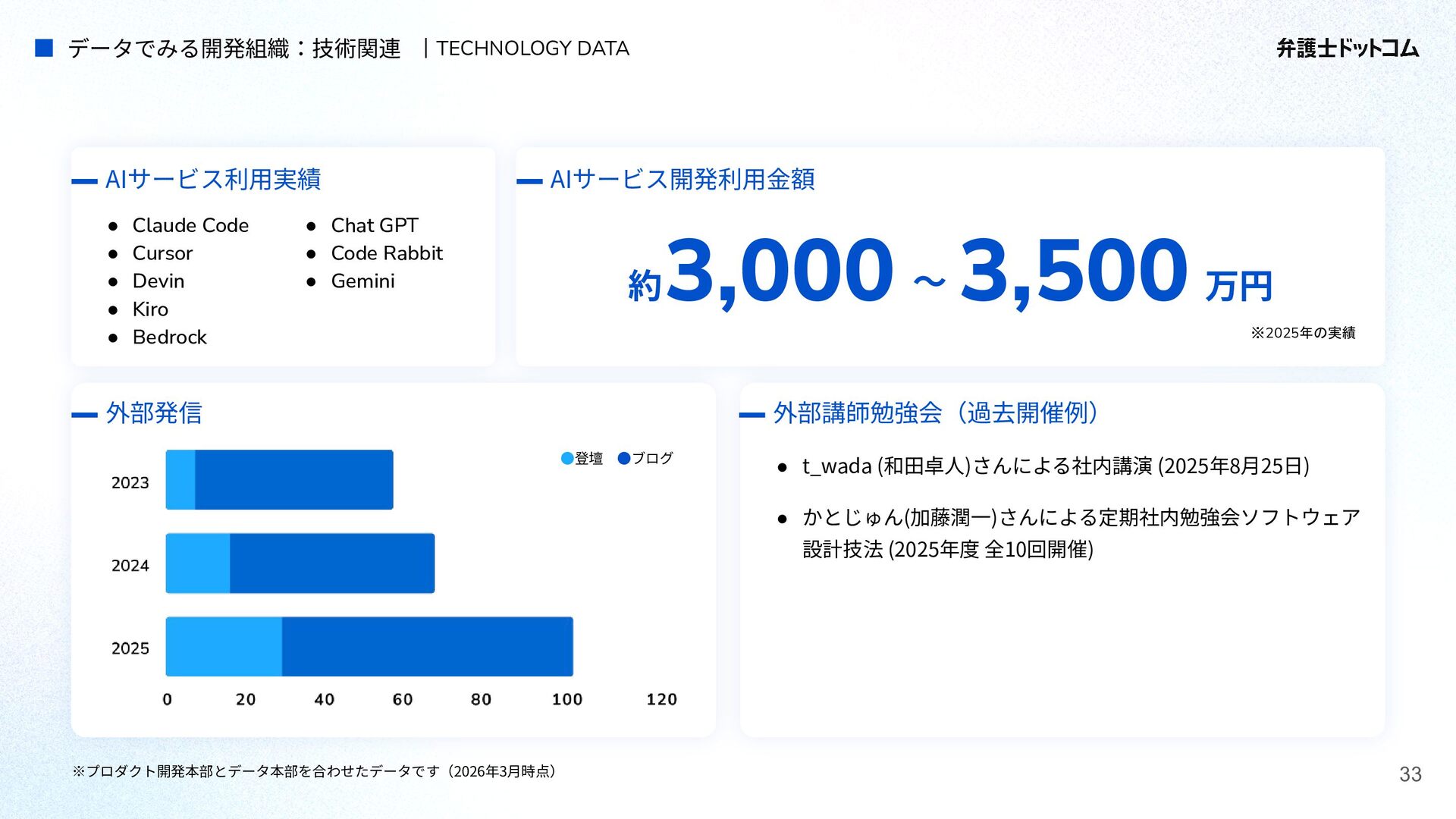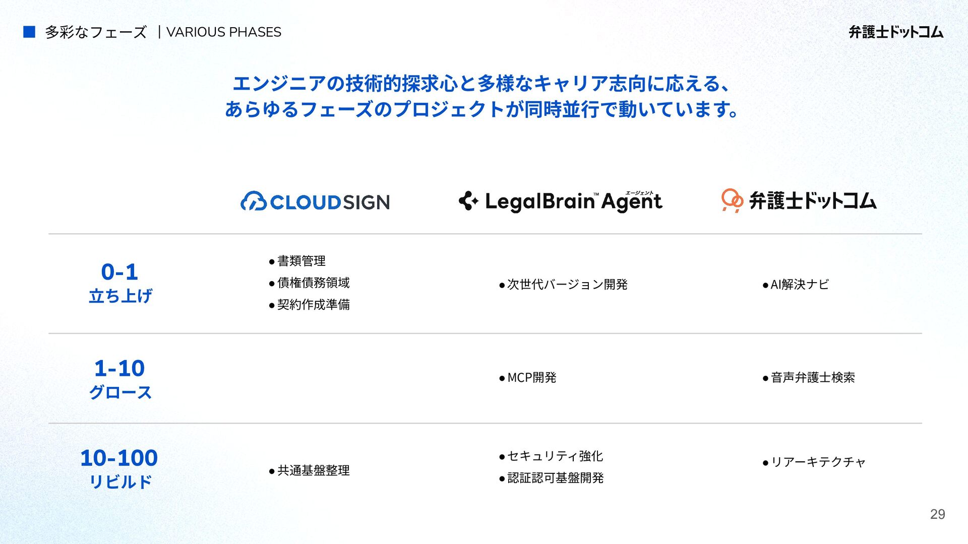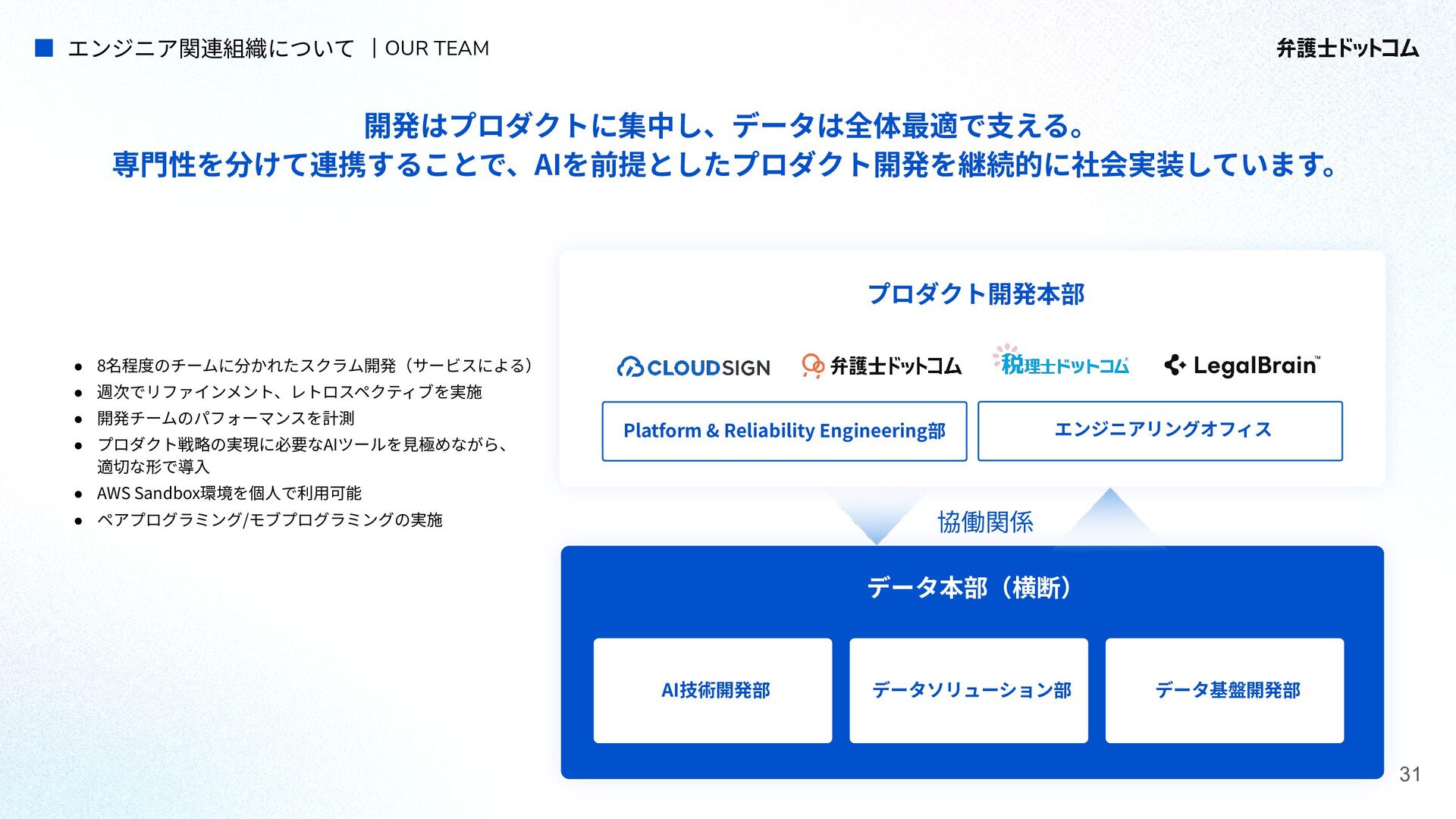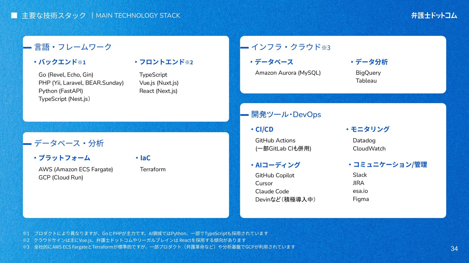 ECS FargateとTerraformが標準的ですが、⼀部プロダクト(弁護⾰命など)や分析基盤でGCPが利⽤されています Go (Revel, Echo, Gin) PHP (Yii, Laravel, BEAR.Sunday) Python (FastAPI) TypeScript (Nest.js) ‧バックエンド※1 ‧フロントエンド※2 TypeScript Vue.js (Nuxt.js) React (Next.js) AWS (Amazon ECS Fargate) GCP (Cloud Run) ‧プラットフォーム ‧IaC Terraform Amazon Aurora (MySQL) ‧データベース ‧データ分析 BigQuery Tableau GitHub Actions (一部GitLab CIも併用) ‧CI/CD ‧モニタリング Datadog CloudWatch ‧AIコーディング GitHub Copilot Cursor Claude Code Devinなど(積極導入中) ‧コミュニケーション/管理 Slack JIRA esa.io Figma ⾔語‧フレームワーク インフラ‧クラウド※3 データベース‧分析 開発ツール・DevOps