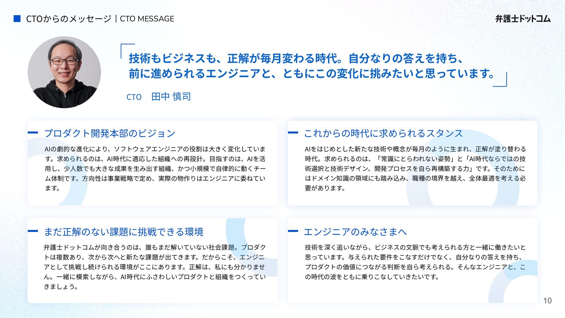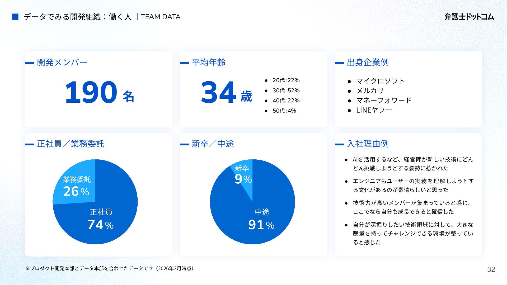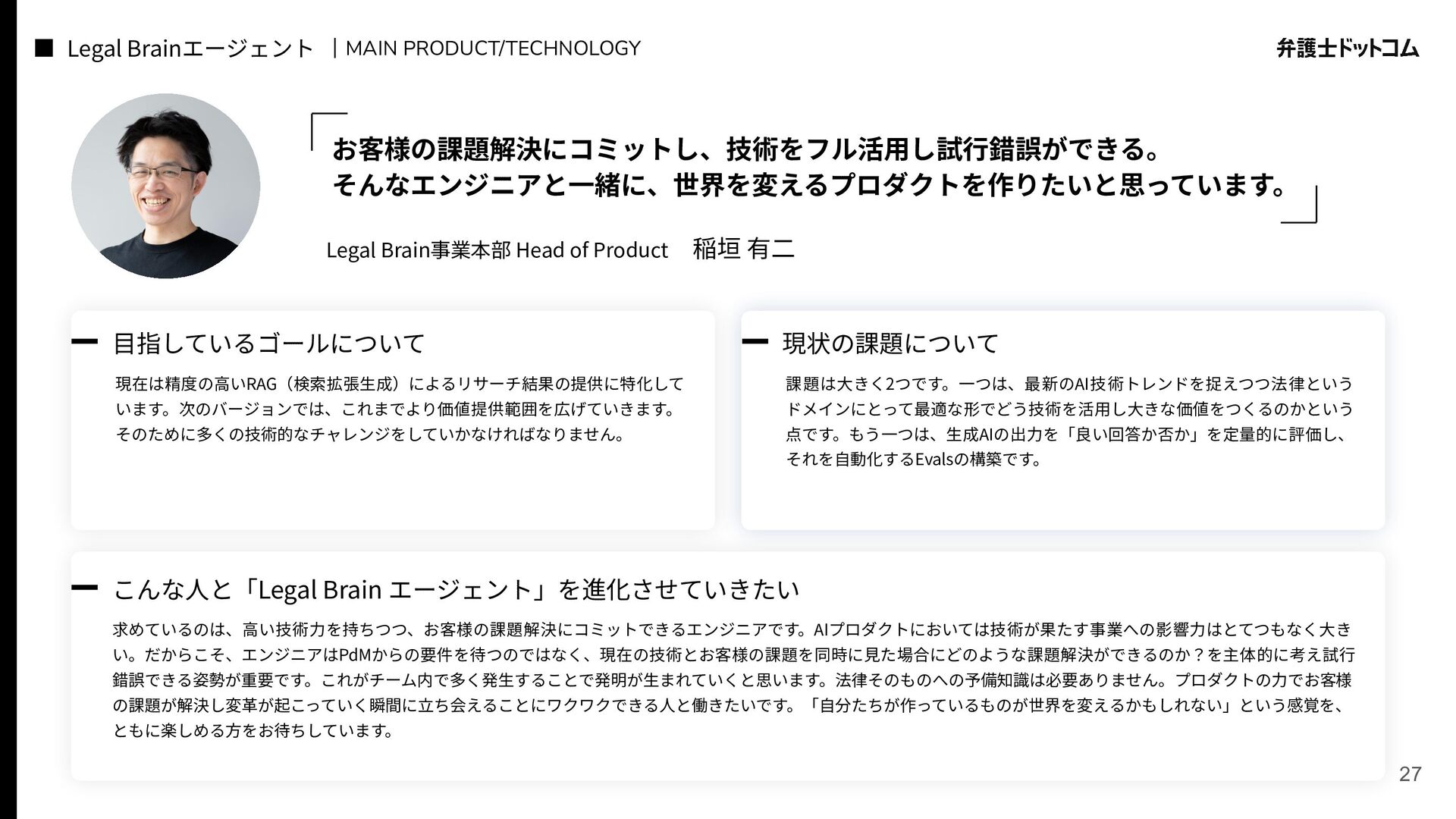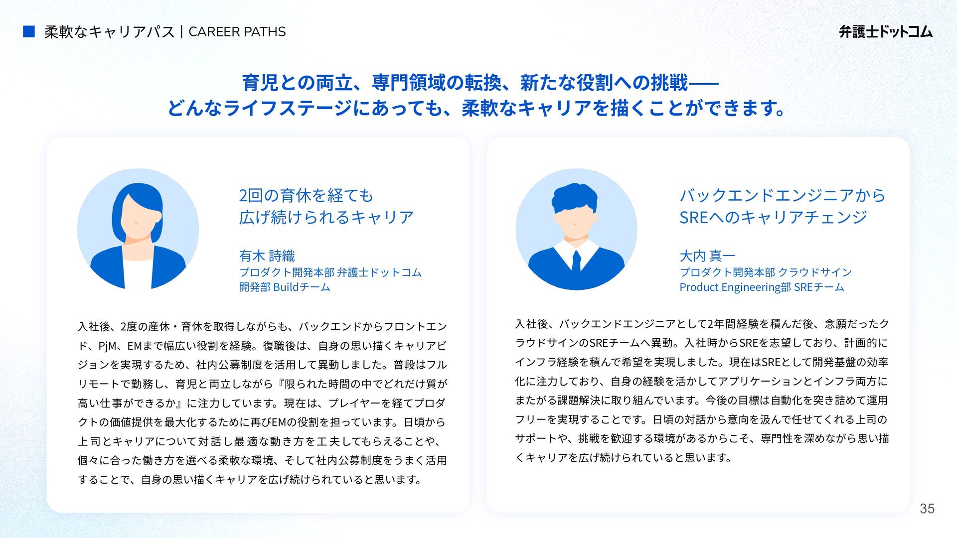 ECS FargateとTerraformが標準的ですが、⼀部プロダクト(弁護⾰命など)や分析基盤でGCPが利⽤されています Go (Revel, Echo, Gin) PHP (Yii, Laravel, BEAR.Sunday) Python (FastAPI) TypeScript (Nest.js) ‧バックエンド※1 ‧フロントエンド※2 TypeScript Vue.js (Nuxt.js) React (Next.js) AWS (Amazon ECS Fargate) GCP (Cloud Run) ‧プラットフォーム ‧IaC Terraform Amazon Aurora (MySQL) ‧データベース ‧データ分析 BigQuery Tableau GitHub Actions (一部GitLab CIも併用) ‧CI/CD ‧モニタリング Datadog CloudWatch ‧AIコーディング GitHub Copilot Cursor Claude Code Devinなど(積極導入中) ‧コミュニケーション/管理 Slack JIRA esa.io Figma ⾔語‧フレームワーク インフラ‧クラウド※3 データベース‧分析 開発ツール・DevOps