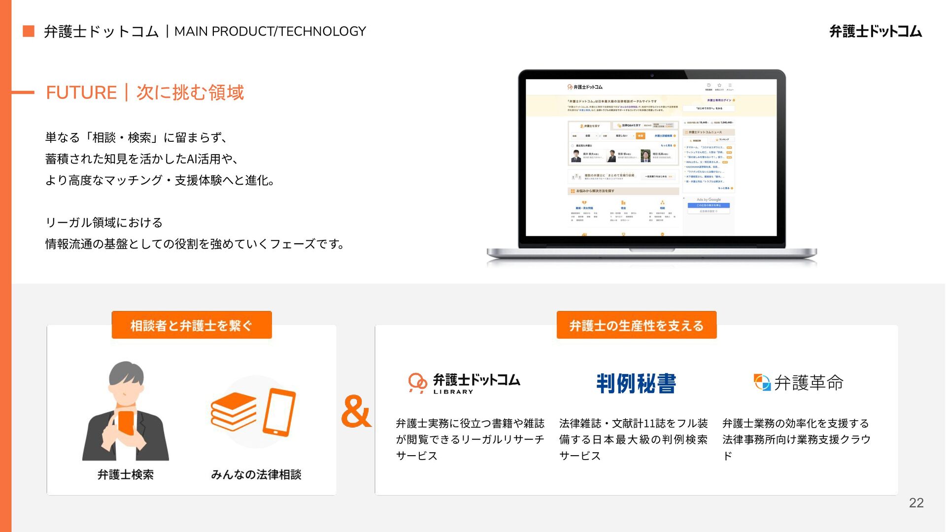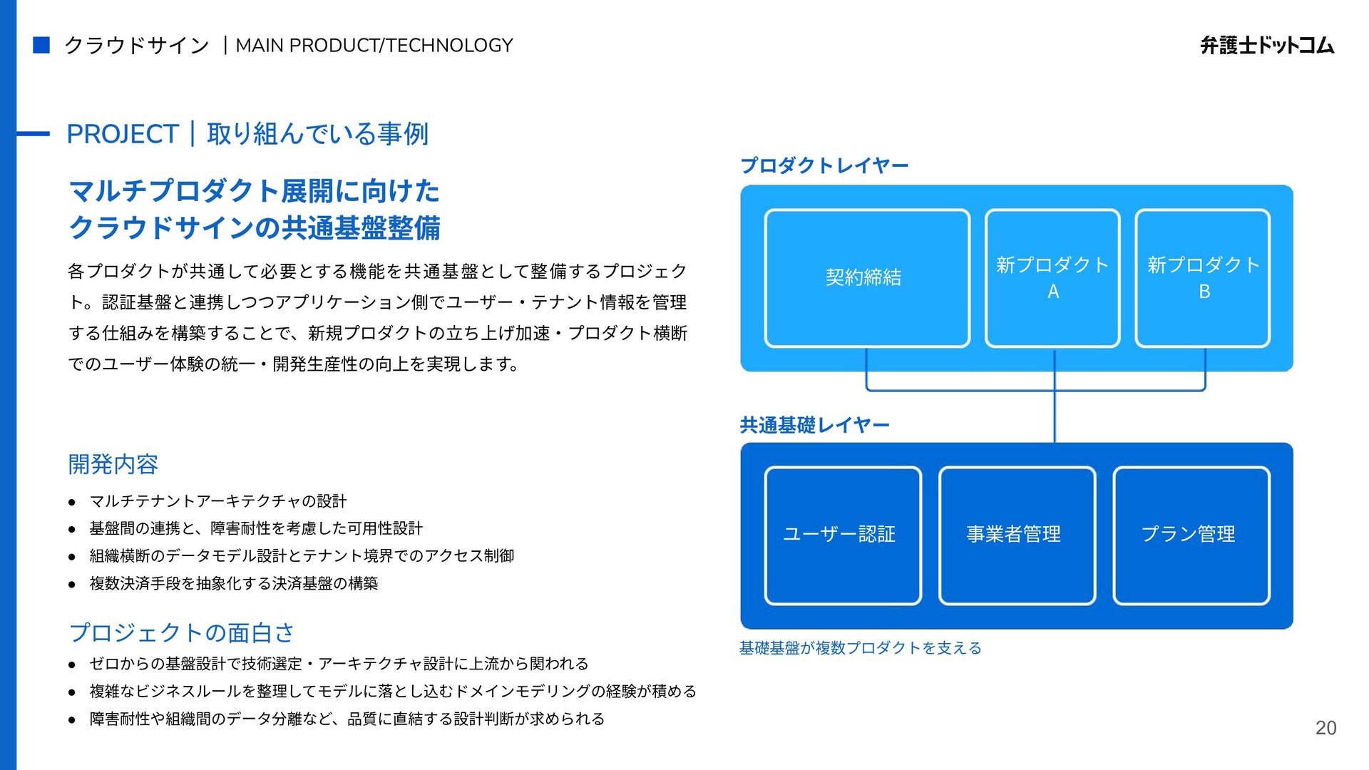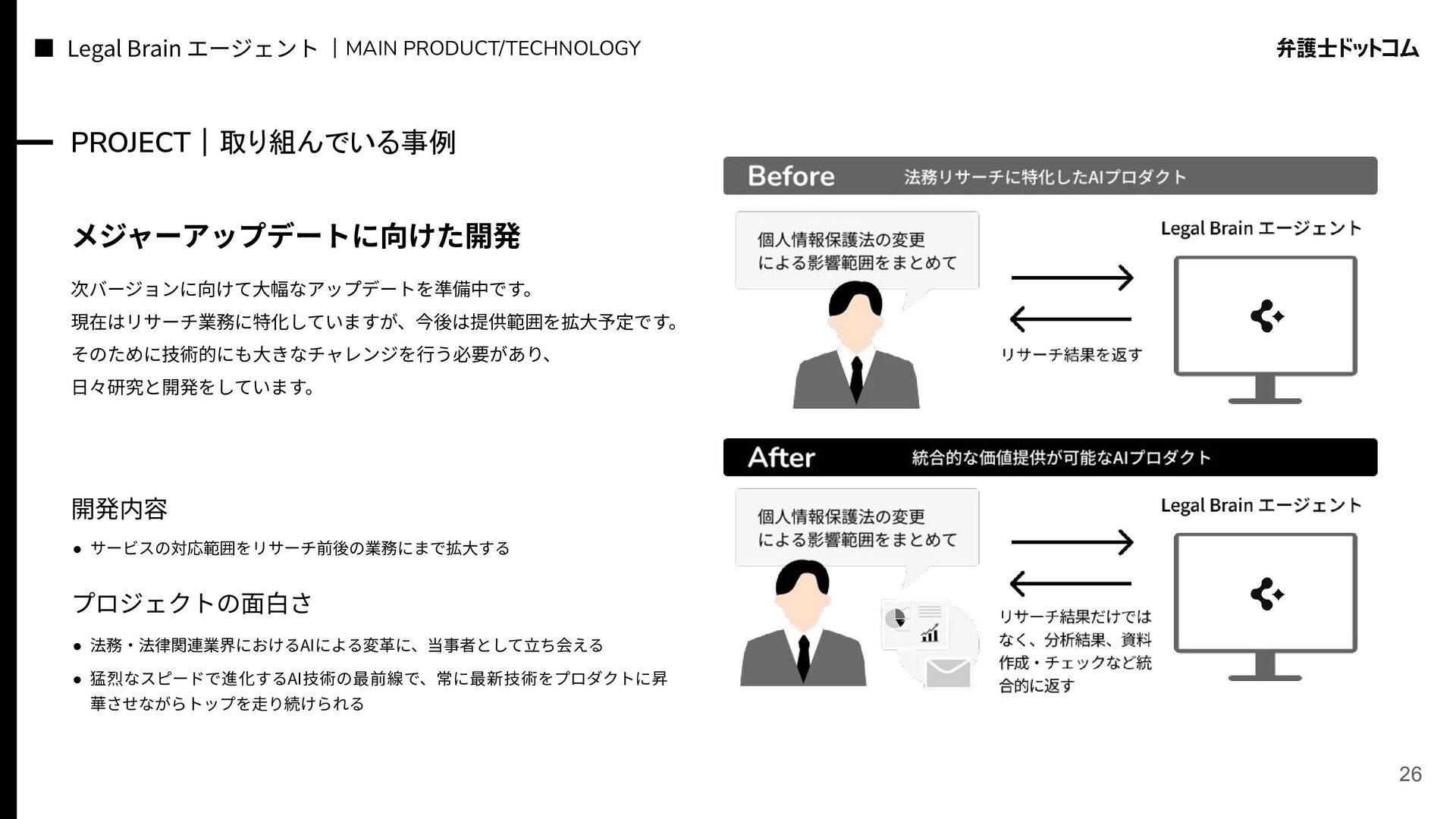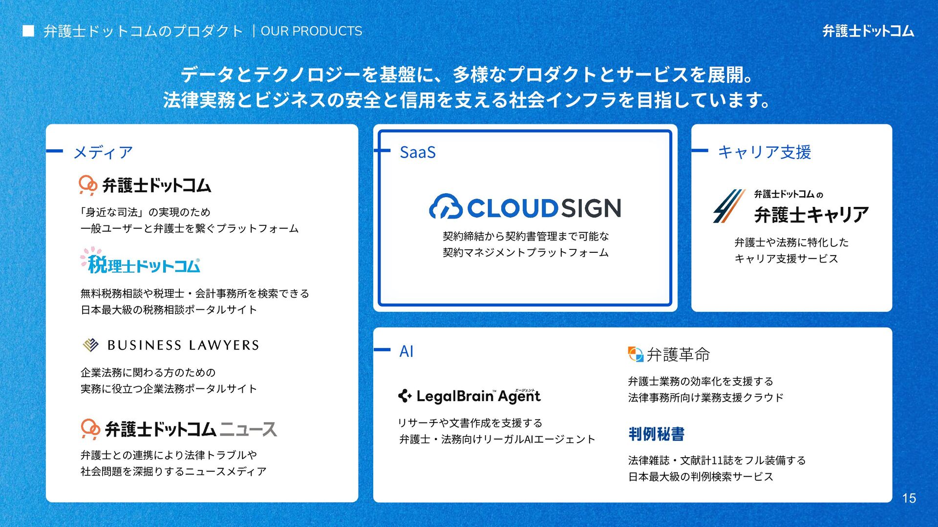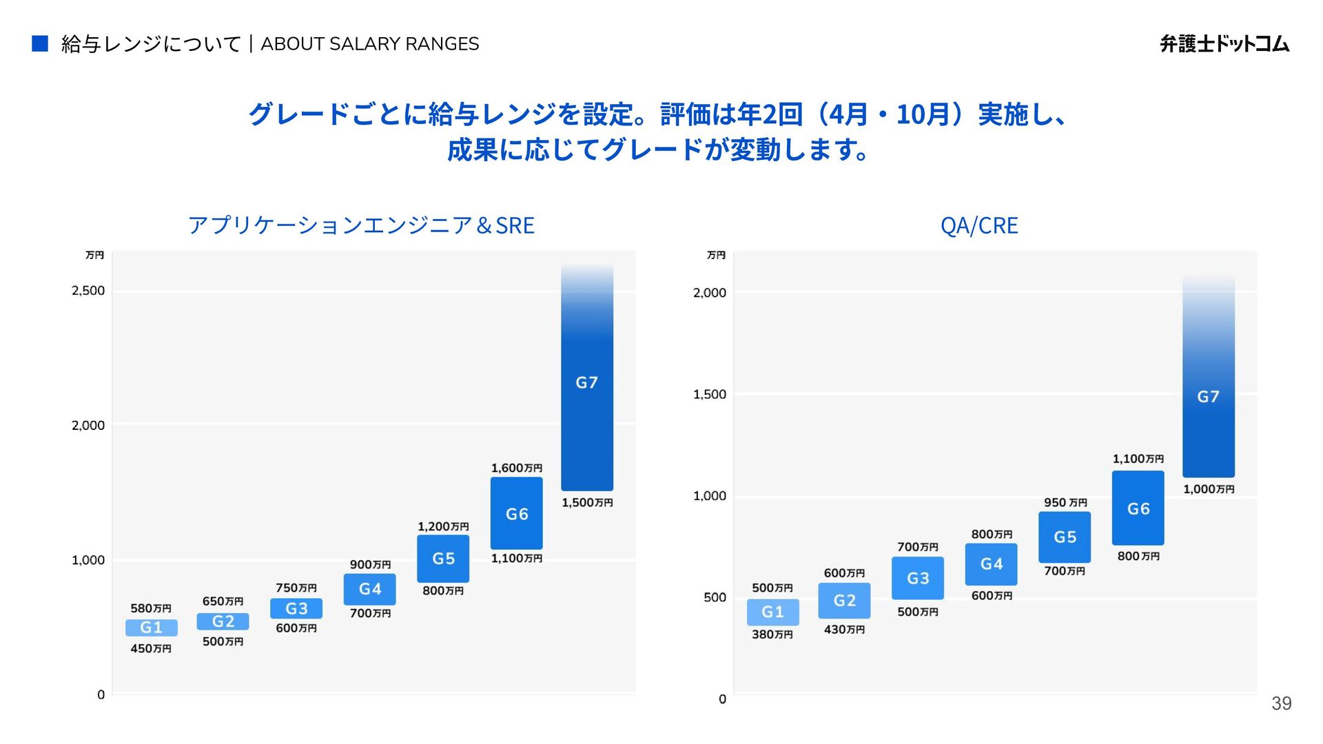 ECS FargateとTerraformが標準的ですが、⼀部プロダクト(弁護⾰命など)や分析基盤でGCPが利⽤されています Go (Revel, Echo, Gin) PHP (Yii, Laravel, BEAR.Sunday) Python (FastAPI) TypeScript (Nest.js) ‧バックエンド※1 ‧フロントエンド※2 TypeScript Vue.js (Nuxt.js) React (Next.js) AWS (Amazon ECS Fargate) GCP (Cloud Run) ‧プラットフォーム ‧IaC Terraform Amazon Aurora (MySQL) ‧データベース ‧データ分析 BigQuery Tableau GitHub Actions (一部GitLab CIも併用) ‧CI/CD ‧モニタリング Datadog CloudWatch ‧AIコーディング GitHub Copilot Cursor Claude Code Devinなど(積極導入中) ‧コミュニケーション/管理 Slack JIRA esa.io Figma ⾔語‧フレームワーク インフラ‧クラウド※3 データベース‧分析 開発ツール・DevOps