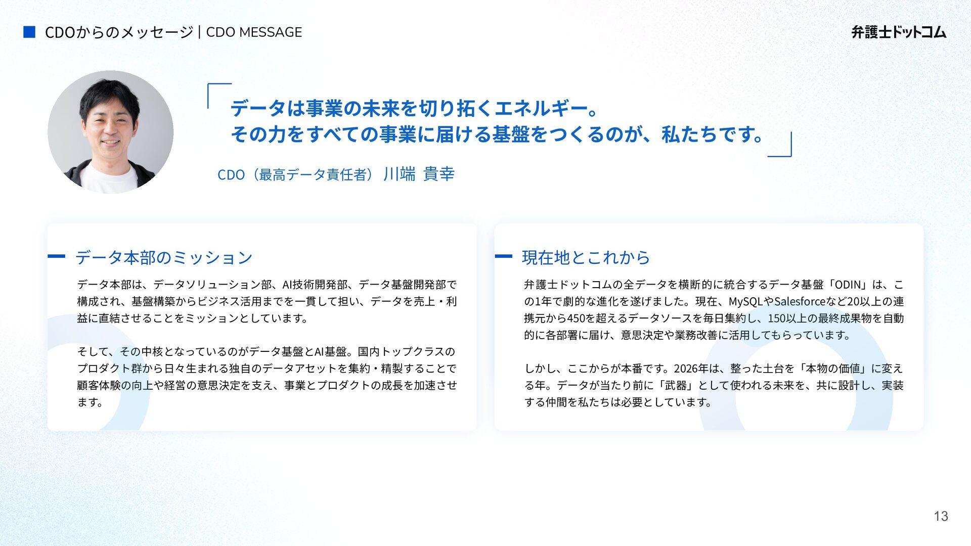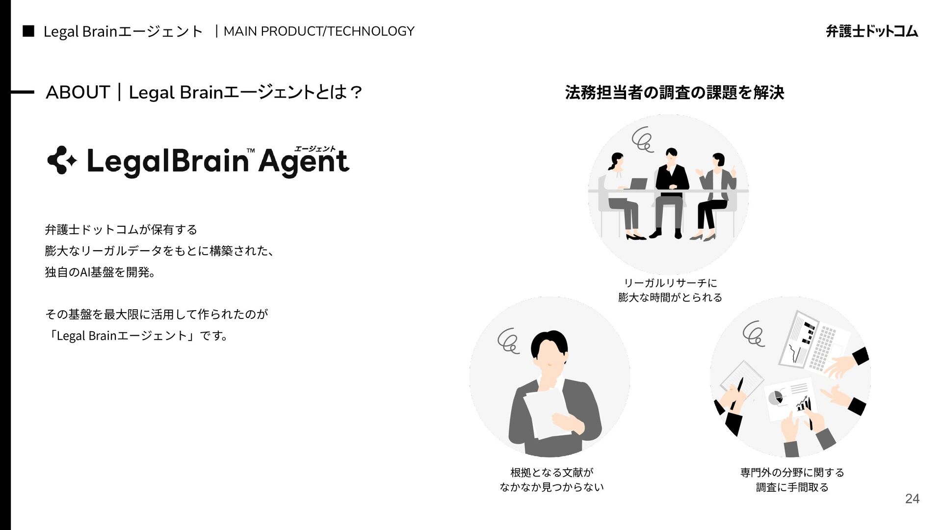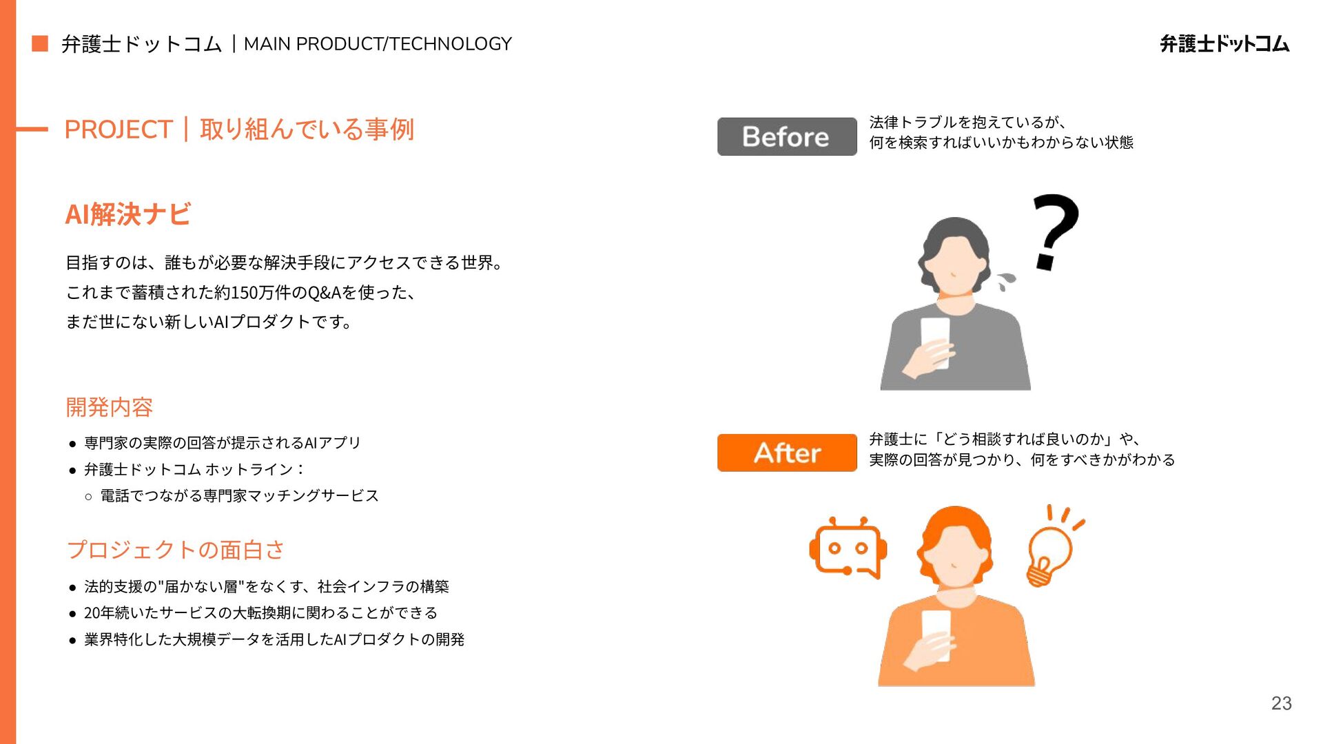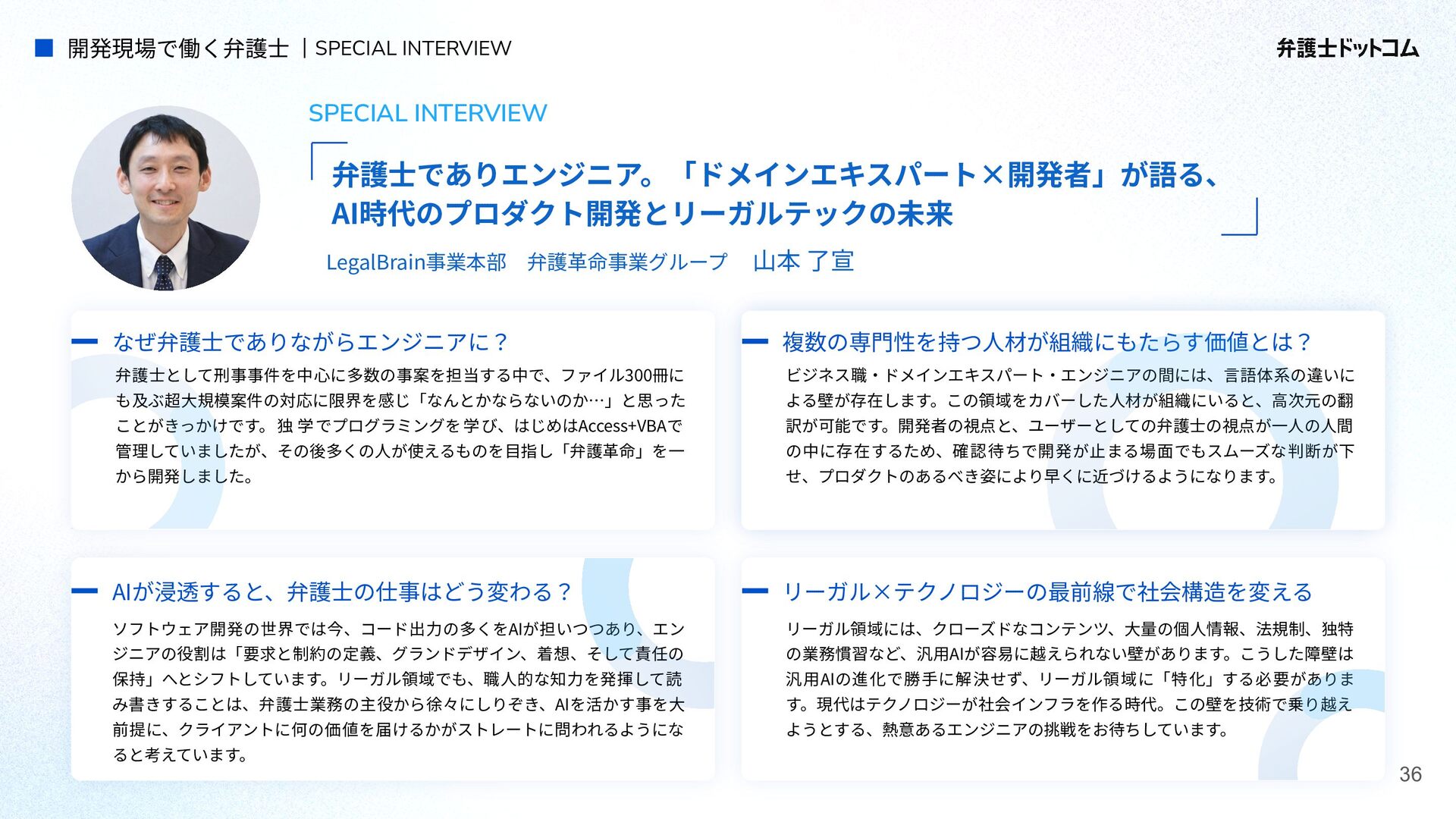 ECS FargateとTerraformが標準的ですが、⼀部プロダクト(弁護⾰命など)や分析基盤でGCPが利⽤されています Go (Revel, Echo, Gin) PHP (Yii, Laravel, BEAR.Sunday) Python (FastAPI) TypeScript (Nest.js) ‧バックエンド※1 ‧フロントエンド※2 TypeScript Vue.js (Nuxt.js) React (Next.js) AWS (Amazon ECS Fargate) GCP (Cloud Run) ‧プラットフォーム ‧IaC Terraform Amazon Aurora (MySQL) ‧データベース ‧データ分析 BigQuery Tableau GitHub Actions (一部GitLab CIも併用) ‧CI/CD ‧モニタリング Datadog CloudWatch ‧AIコーディング GitHub Copilot Cursor Claude Code Devinなど(積極導入中) ‧コミュニケーション/管理 Slack JIRA esa.io Figma ⾔語‧フレームワーク インフラ‧クラウド※3 データベース‧分析 開発ツール・DevOps