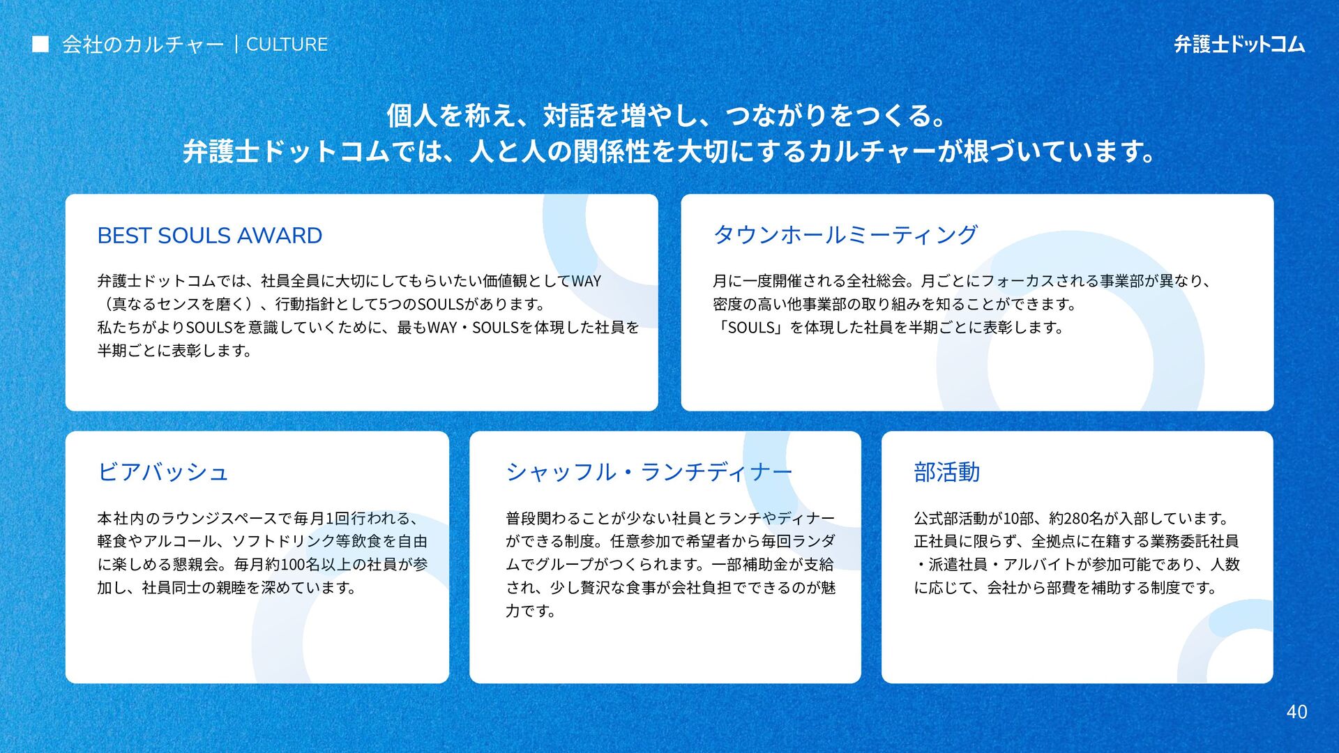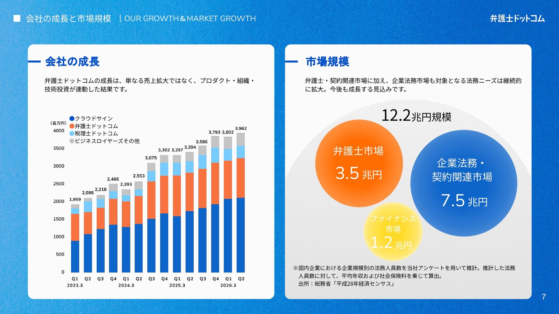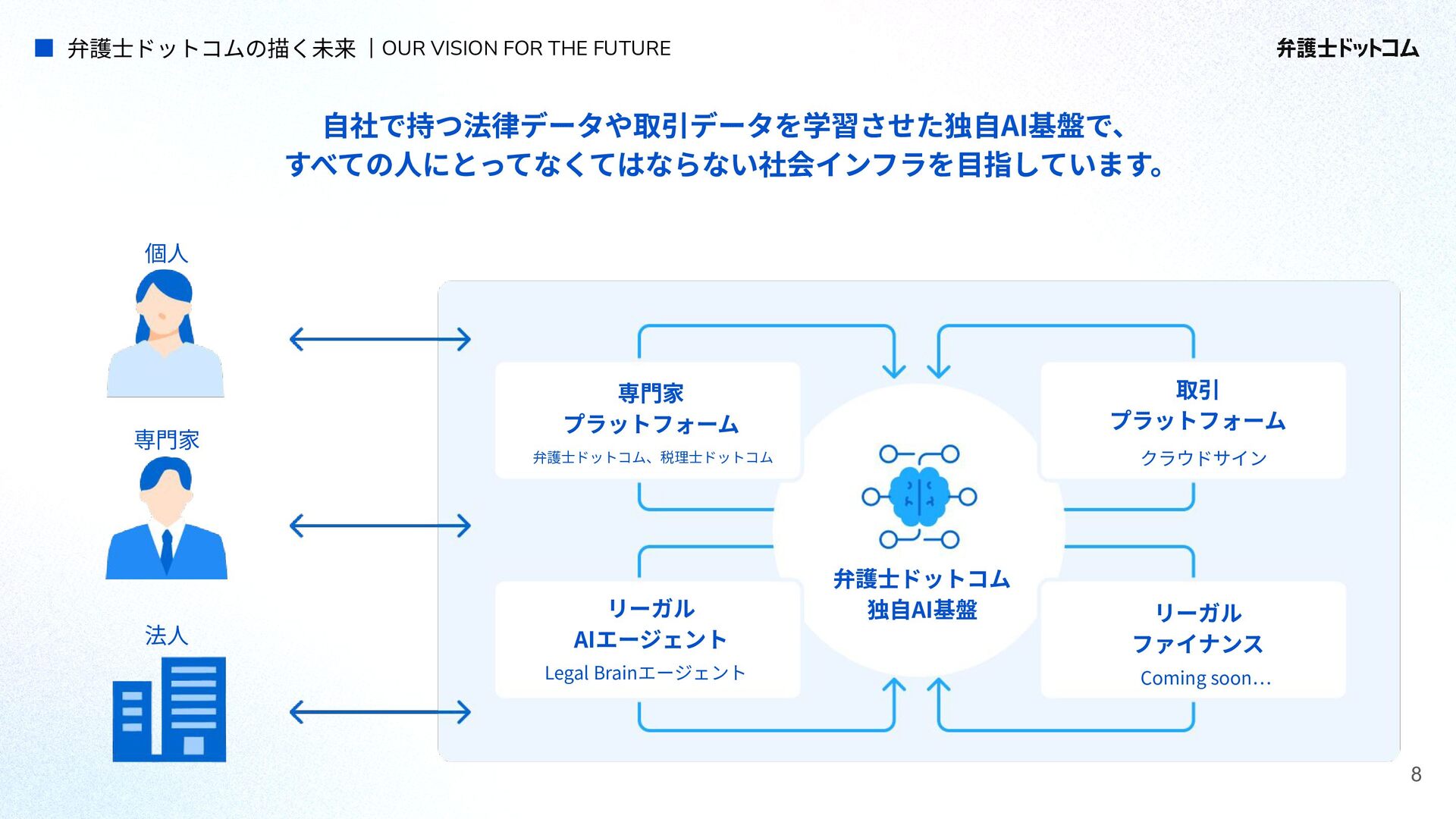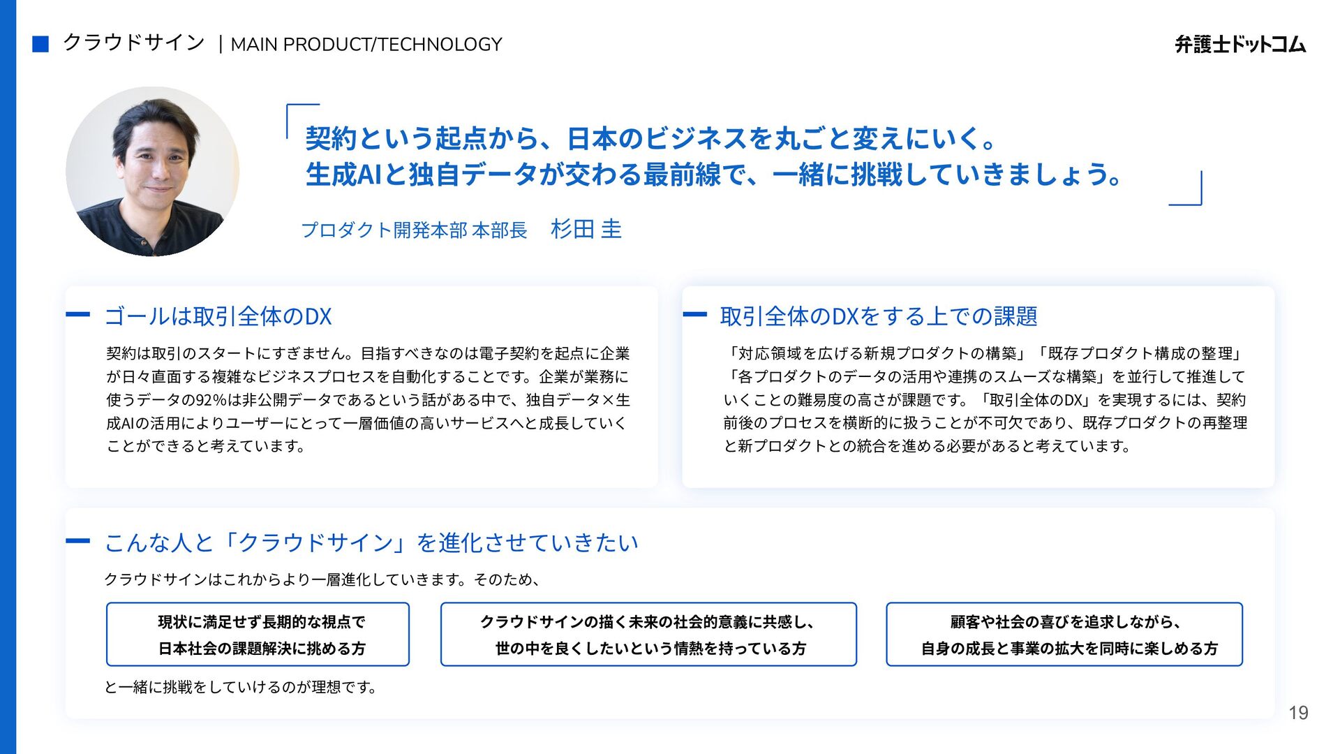ECS FargateとTerraformが標準的ですが、⼀部プロダクト(弁護⾰命など)や分析基盤でGCPが利⽤されています Go (Revel, Echo, Gin) PHP (Yii, Laravel, BEAR.Sunday) Python (FastAPI) TypeScript (Nest.js) ‧バックエンド※1 ‧フロントエンド※2 TypeScript Vue.js (Nuxt.js) React (Next.js) AWS (Amazon ECS Fargate) GCP (Cloud Run) ‧プラットフォーム ‧IaC Terraform Amazon Aurora (MySQL) ‧データベース ‧データ分析 BigQuery Tableau GitHub Actions (一部GitLab CIも併用) ‧CI/CD ‧モニタリング Datadog CloudWatch ‧AIコーディング GitHub Copilot Cursor Claude Code Devinなど(積極導入中) ‧コミュニケーション/管理 Slack JIRA esa.io Figma ⾔語‧フレームワーク インフラ‧クラウド※3 データベース‧分析 開発ツール・DevOps