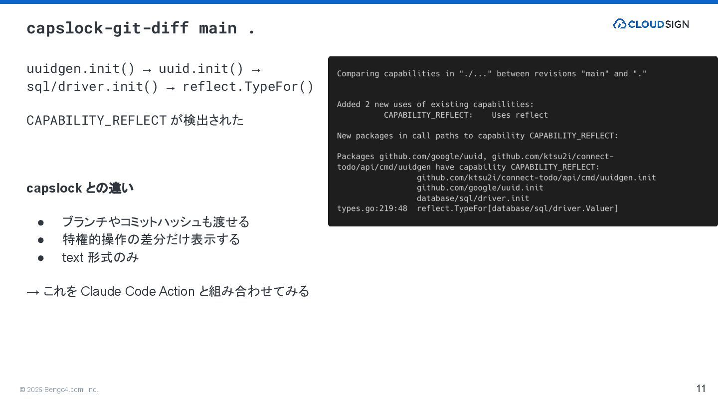 uuid.init() → sql/driver.init() → reflect.TypeFor() CAPABILITY_REFLECT が検出された capslock との違い • ブランチやコミットハッシュも渡せる • 特権的操作の差分だけ表示する • text 形式のみ → これを Claude Code Action と組み合わせてみる