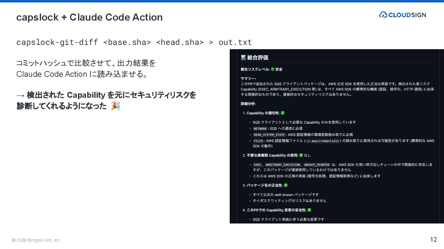 Claude Code Action に読み込ませる。 → 検出された Capability を元にセキュリティリスクを 診断してくれるようになった 🎉 capslock + Claude Code Action 12