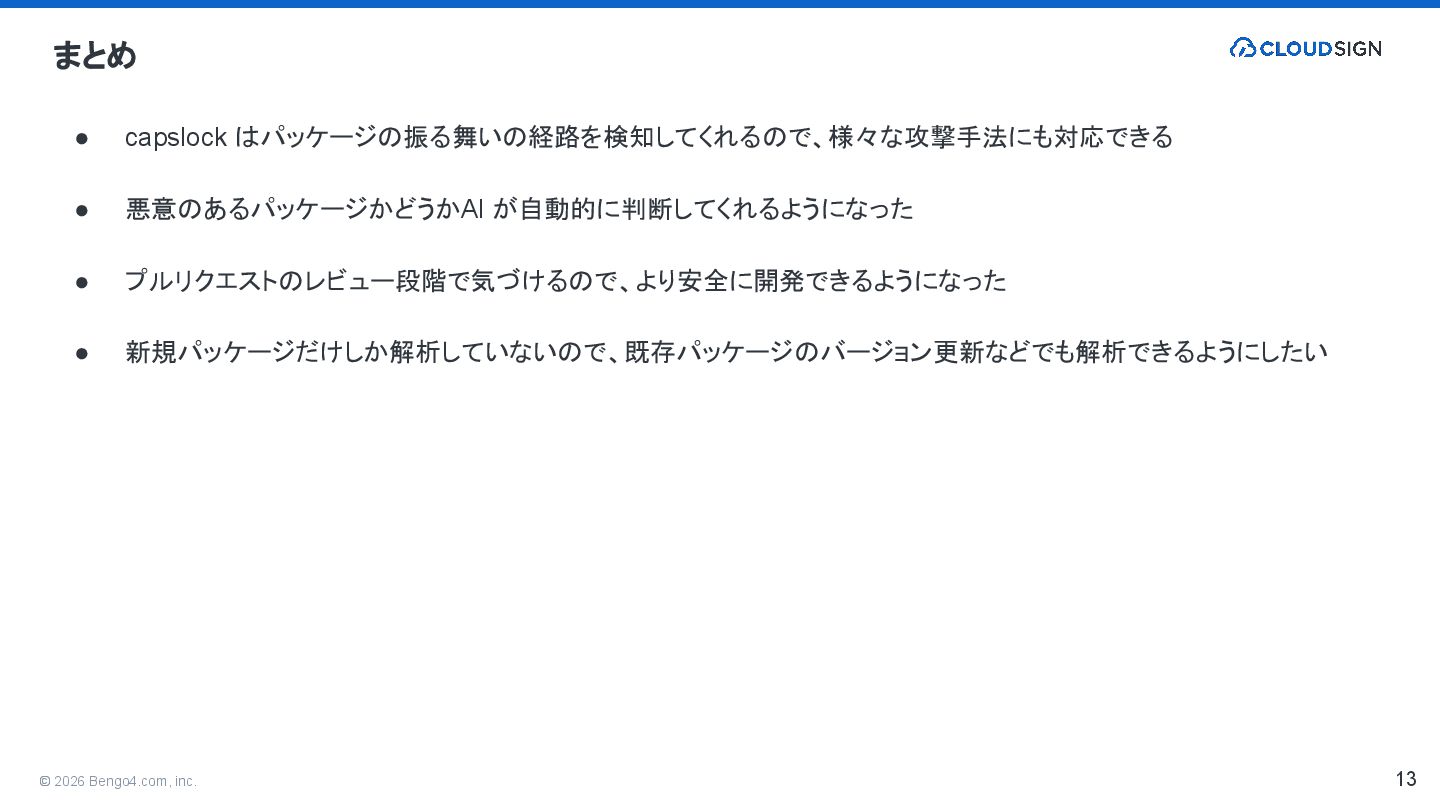 8. © 2026 Bengo4.com, inc. まとめ 13 • capslock はパッケージの振る舞いの経路を検知してくれるので、様々な攻撃手法にも対応できる •