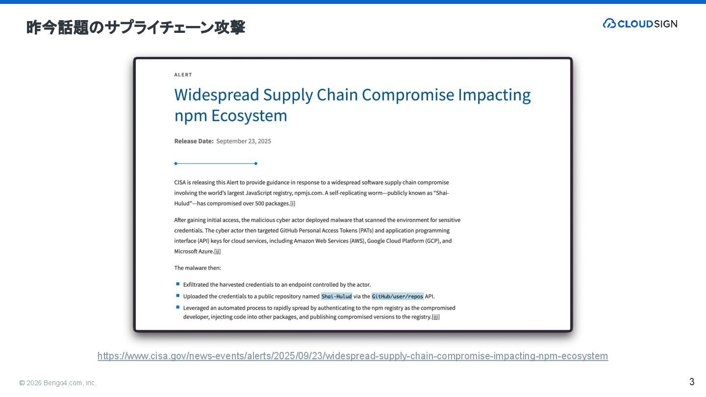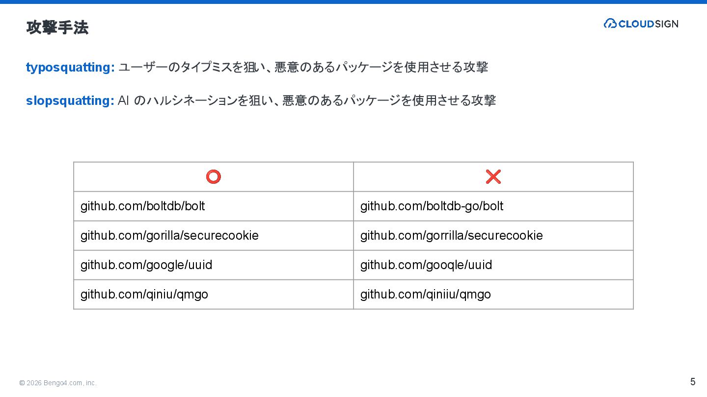 2. © 2026 Bengo4.com, inc. 攻撃手法 typosquatting: ユーザーのタイプミスを狙 い、悪意のあるパッケージを使用させる攻撃 slopsquatting: AI