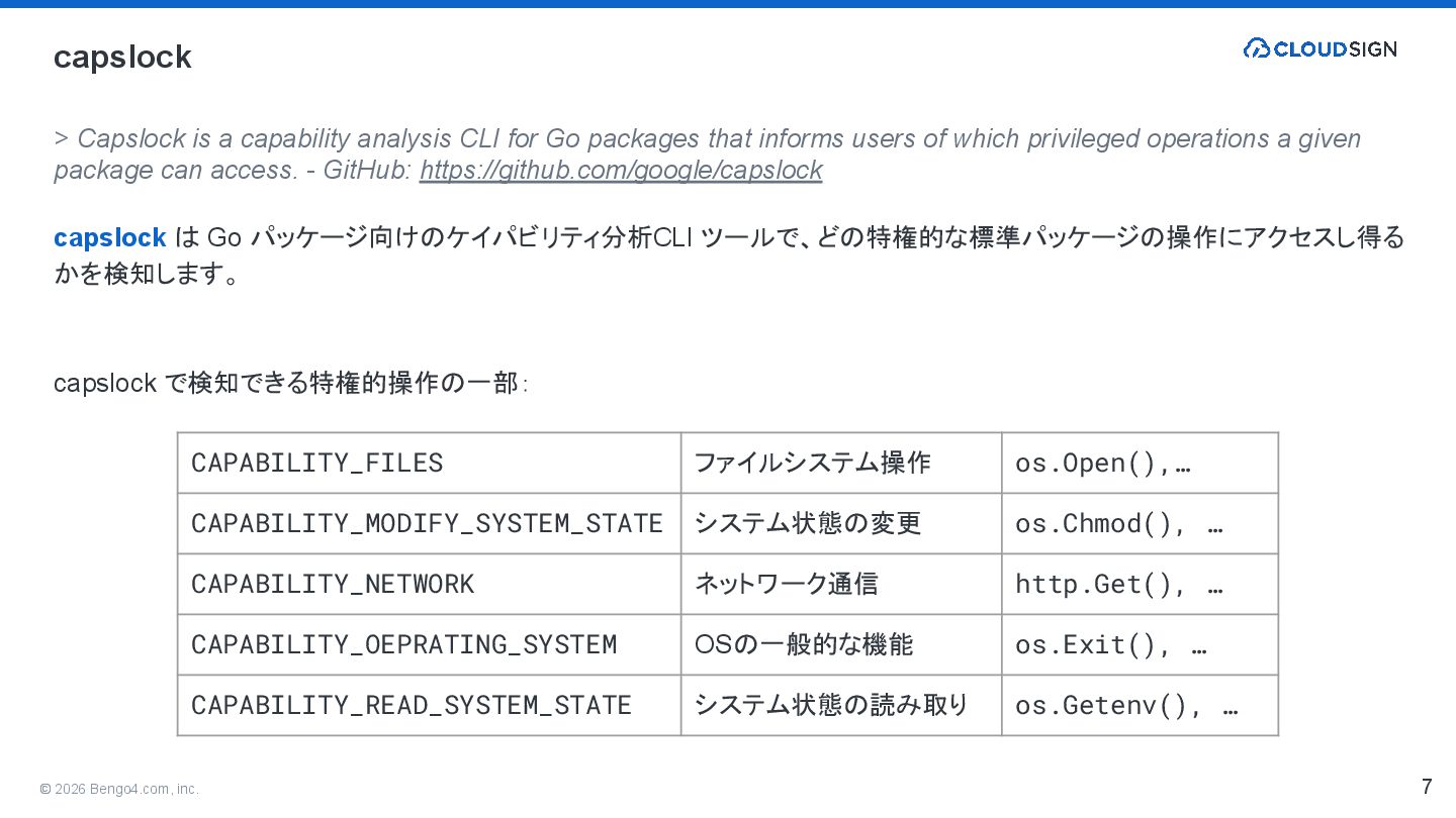 analysis CLI for Go packages that informs users of which privileged operations a given package can access. - GitHub: https://github.com/google/capslock capslock は Go パッケージ向けのケイパビリティ分析 CLI ツールで、どの特権的な標準パッケージの操作にアクセスし得る かを検知します。 capslock で検知できる特権的操作の一部: 7 CAPABILITY_FILES ファイルシステム操作 os.Open(),… CAPABILITY_MODIFY_SYSTEM_STATE システム状態の変更 os.Chmod(), … CAPABILITY_NETWORK ネットワーク通信 http.Get(), … CAPABILITY_OEPRATING_SYSTEM OSの一般的な機能 os.Exit(), … CAPABILITY_READ_SYSTEM_STATE システム状態の読み取り os.Getenv(), …