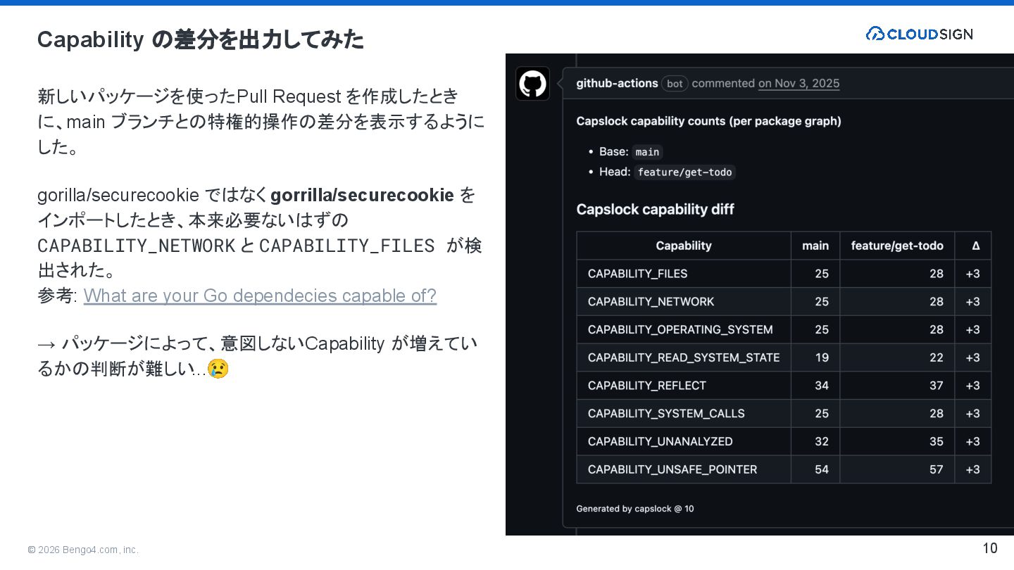 に、main ブランチとの特権的操作の差分を表示するように した。 gorilla/securecookie ではなく gorrilla/securecookie を インポートしたとき、本来必要ないはずの CAPABILITY_NETWORK と CAPABILITY_FILES が検 出された。 参考: What are your Go dependecies capable of? → パッケージによって、意図しない Capability が増えてい るかの判断が難しい...😢 10